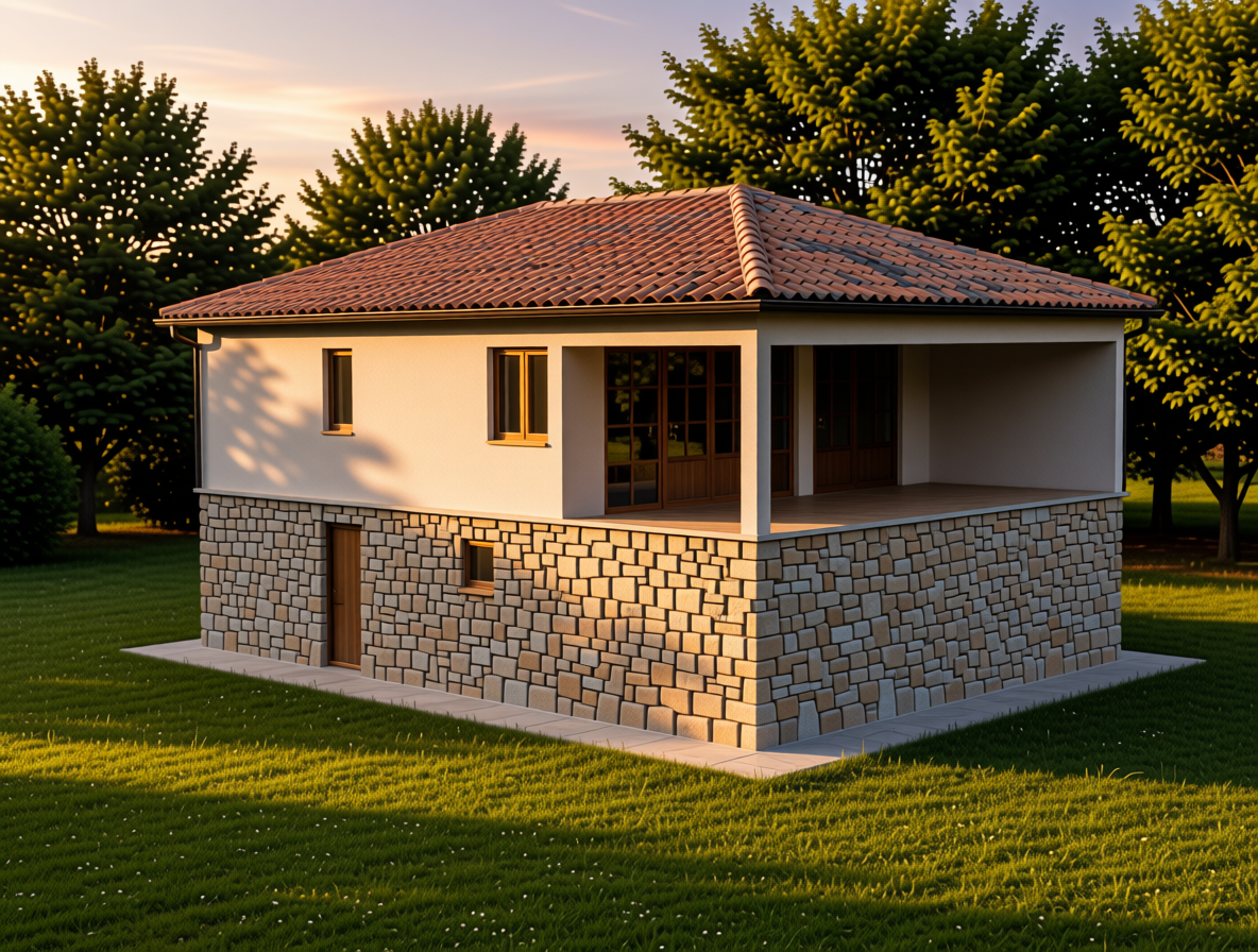casa de dos plantas con planta baja revestida de piedra de peque o tama o y planta primera con acabado de mortero de cal la cubierta es de teja y est situada en una zona con arbolado y cesped la hora del d a es el atardecer desde la vivienda hacia el porche de planta primera hay una zona acristalada de gran dimensi n