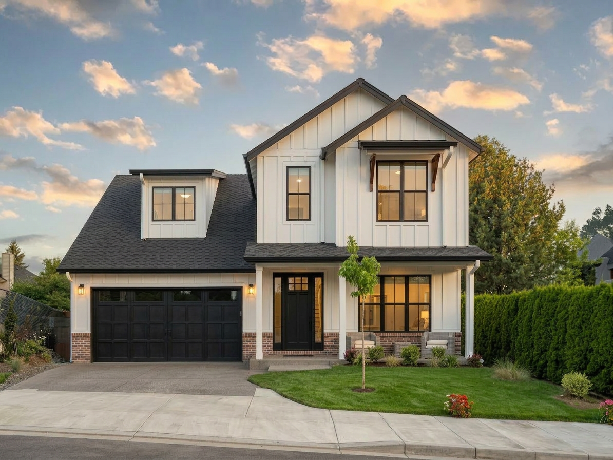 modernist exterior shot replace the board and batten siding with shakes and upate to a dark color package architecture