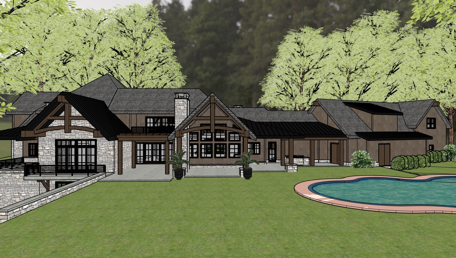modern farmhouse in the woods vertical wood siding with stone facade slate roof inground with grass yard and rustic landscape with shrubs trees bright sunny sky with the sun shining through