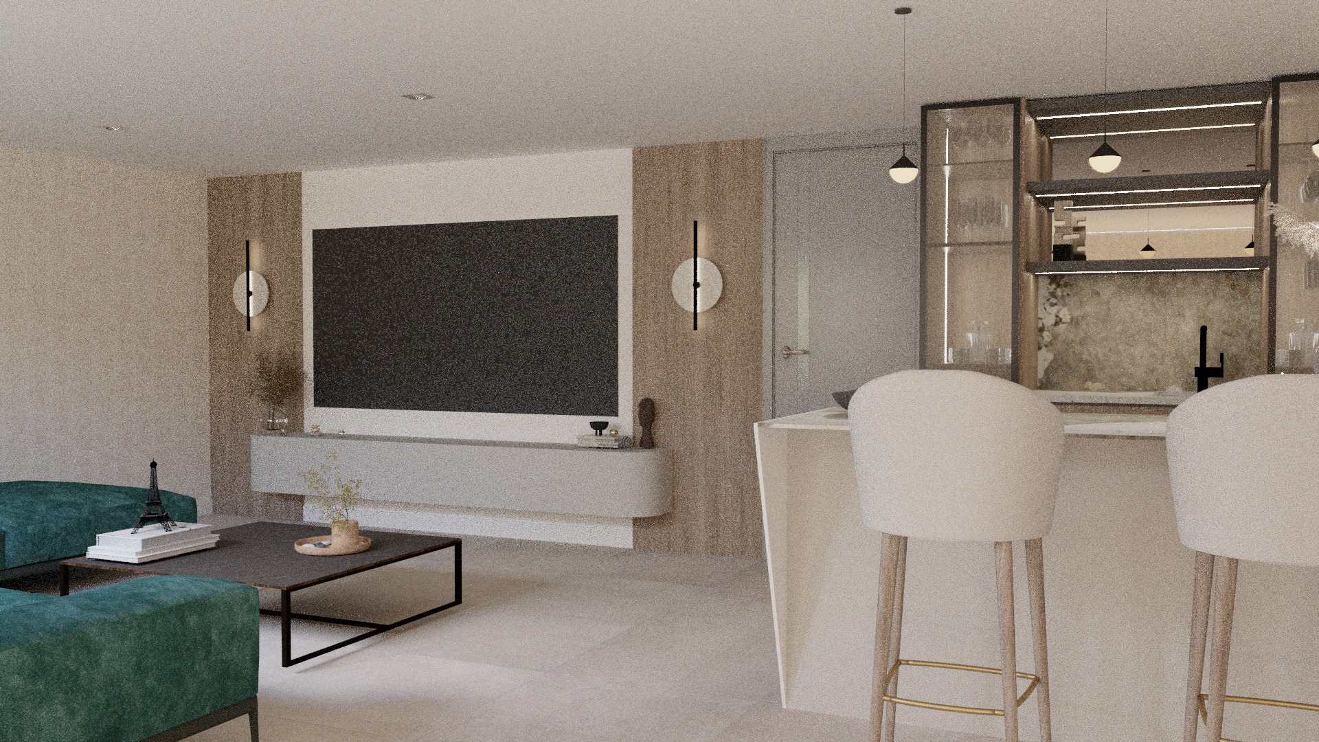 neceisto mejorar esta imagen fotorealista profesional elimina ruidos y mejora las texturas sin cambiar nada regula el tono de la imagen se ve demasado amarilla en las vitrinas el vidrio debe ser mas transparente cambia el cuadro que hay en la pared por algo mas suave mas en tono neutro en la tv pon una imagen del logo de netflix