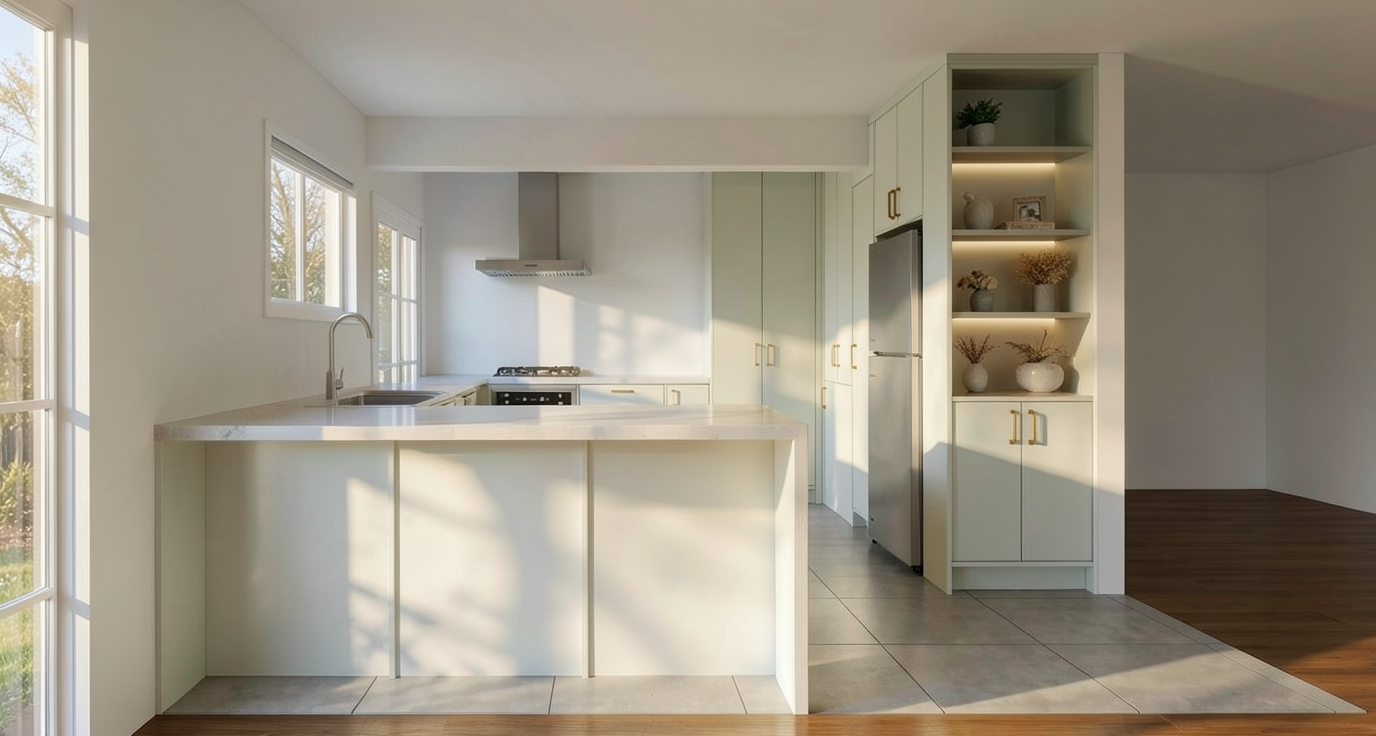 neoclassical interior shot create a serene modern architectural interior with high ceilings and large windows use soft warm light to cast gentle shadows across the room the walls and columns should be a light beige contrasted with white beams on the ceiling infuse the space with a sense of openness and tranquility adding faint touches of greenery near the windows the atmosphere should feel calm and inviting with a minimalist aesthetic and an emphasis on natural light architecture