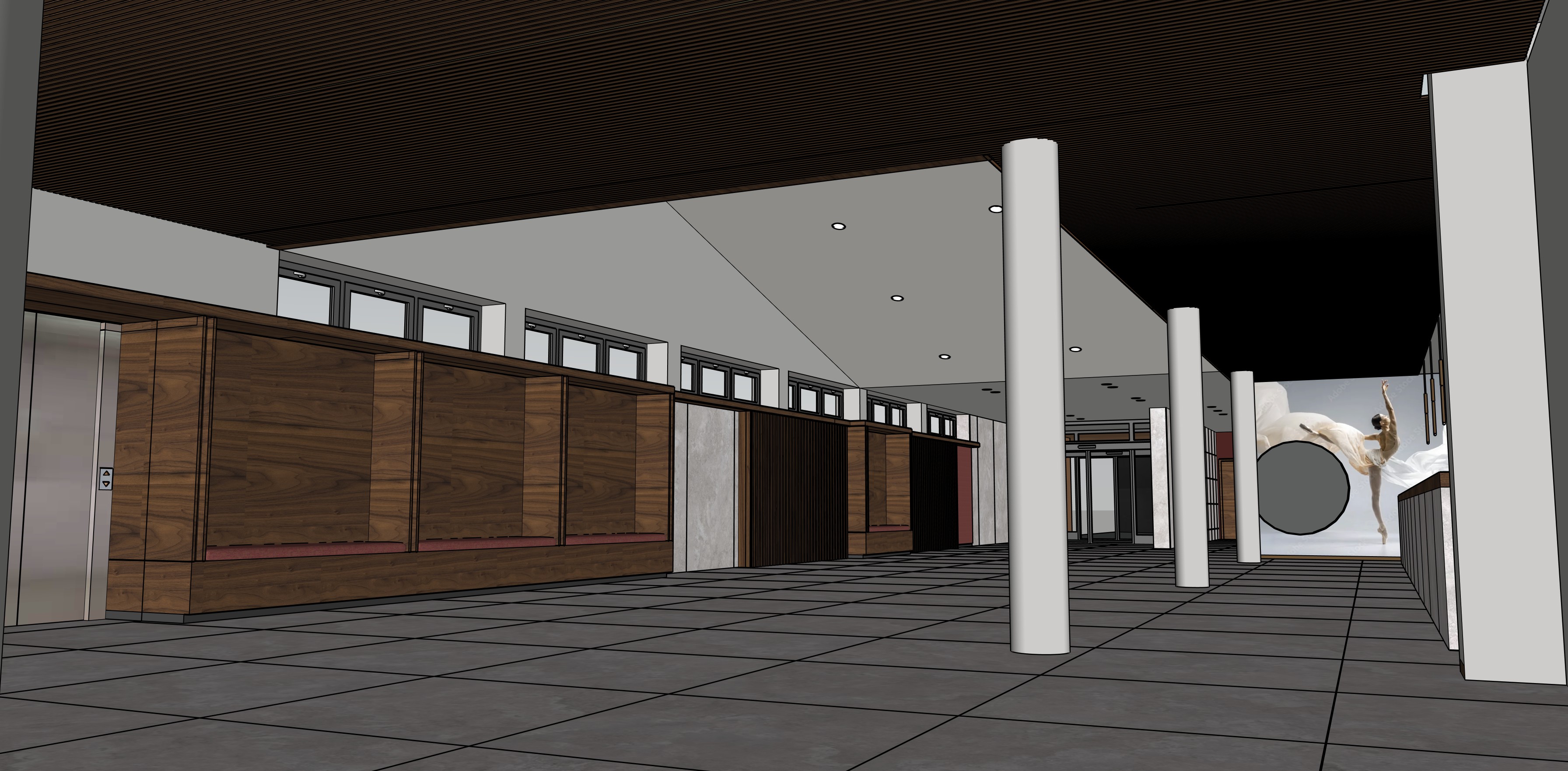 modern cultural building foyer interior warm light from window elegant people people also in front of picture wooden frames with hidden led lights on the left with people sitting on them light interior matte floor led between ceiling slats spotlights on a sloping ceiling circular mirror with backlight photo wallpaper