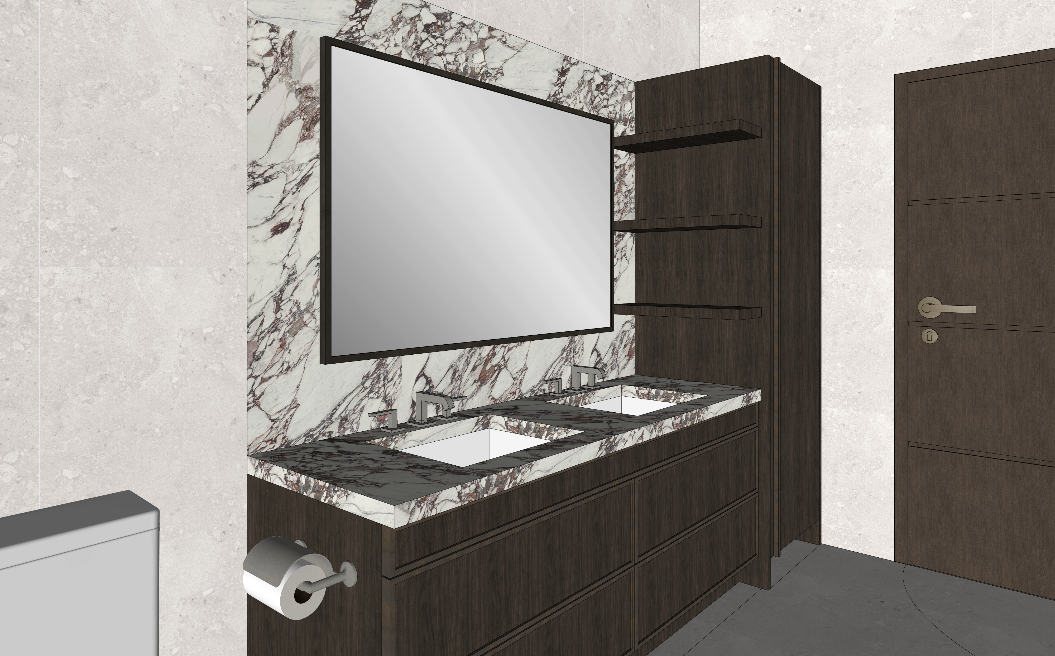 add lighting fixtures above mirror make lighting come directly above that is warm and not too bright