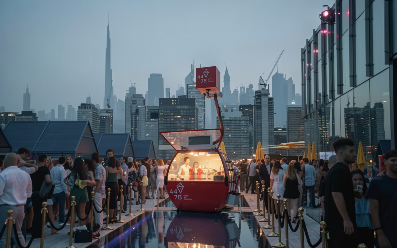 put people on the road on the left and make it illuminated add people on the platform in front of the sign