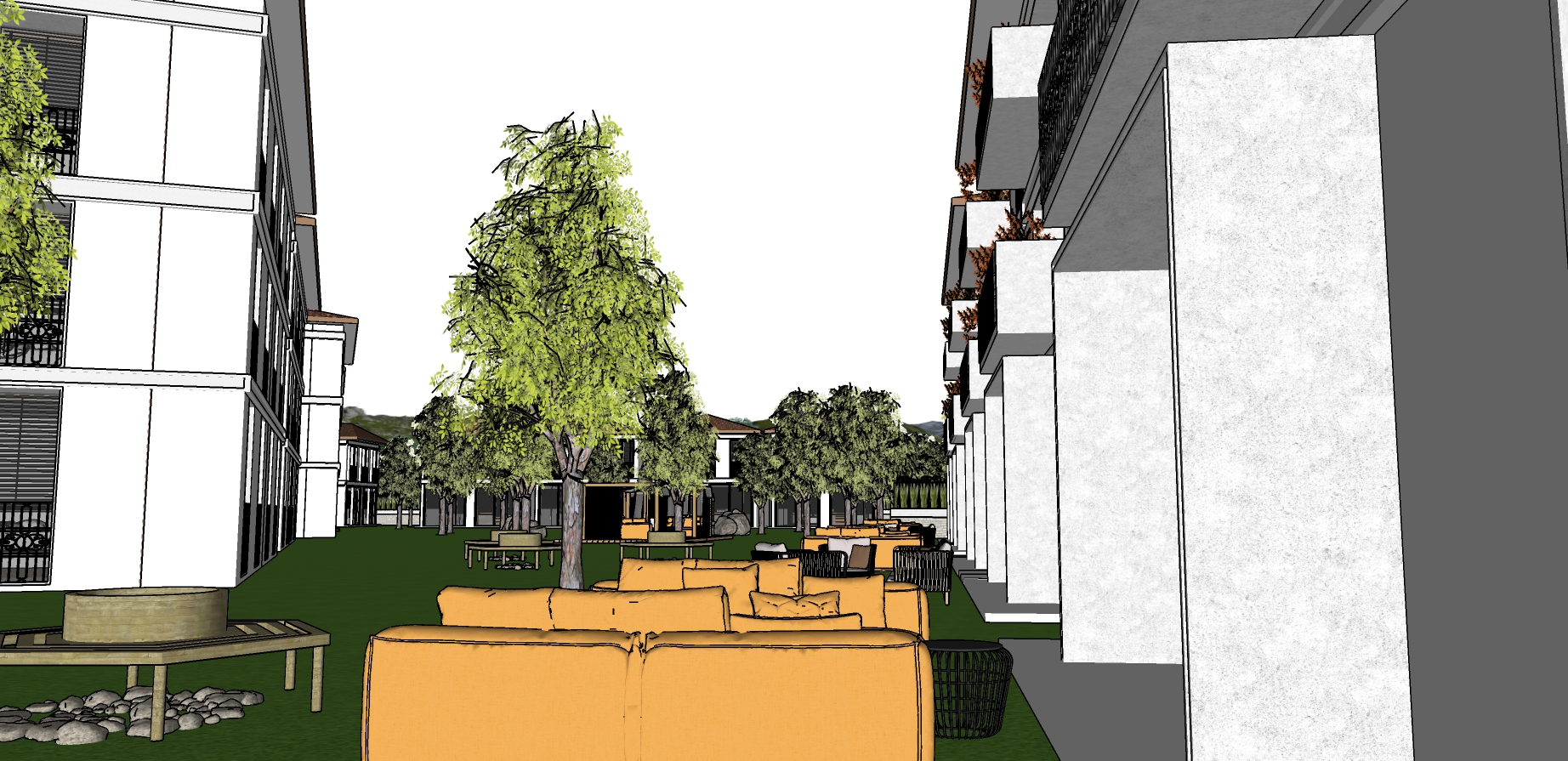 create a picturesque landscape featuring a modern to neoclassical residential complex the buildings showcase white walls with elegant black accents and warm dark brown terracotta roofs surround the area with lush green grass and vibrant trees using varying shades of green to add depth the road is a smooth dark gray asphalt lined with trees whose trunks are a natural brown and foliage a mix of light and dark greens the horizon reveals rolling hills painted in earthy brown and green under a bright and clear sky set the atmosphere to be bright and serene evoking a sharp suburban morning add green alongside the fence perimeter some kids playing in the garden sky blue with some white clouds add some furniture inside the villas and apartments