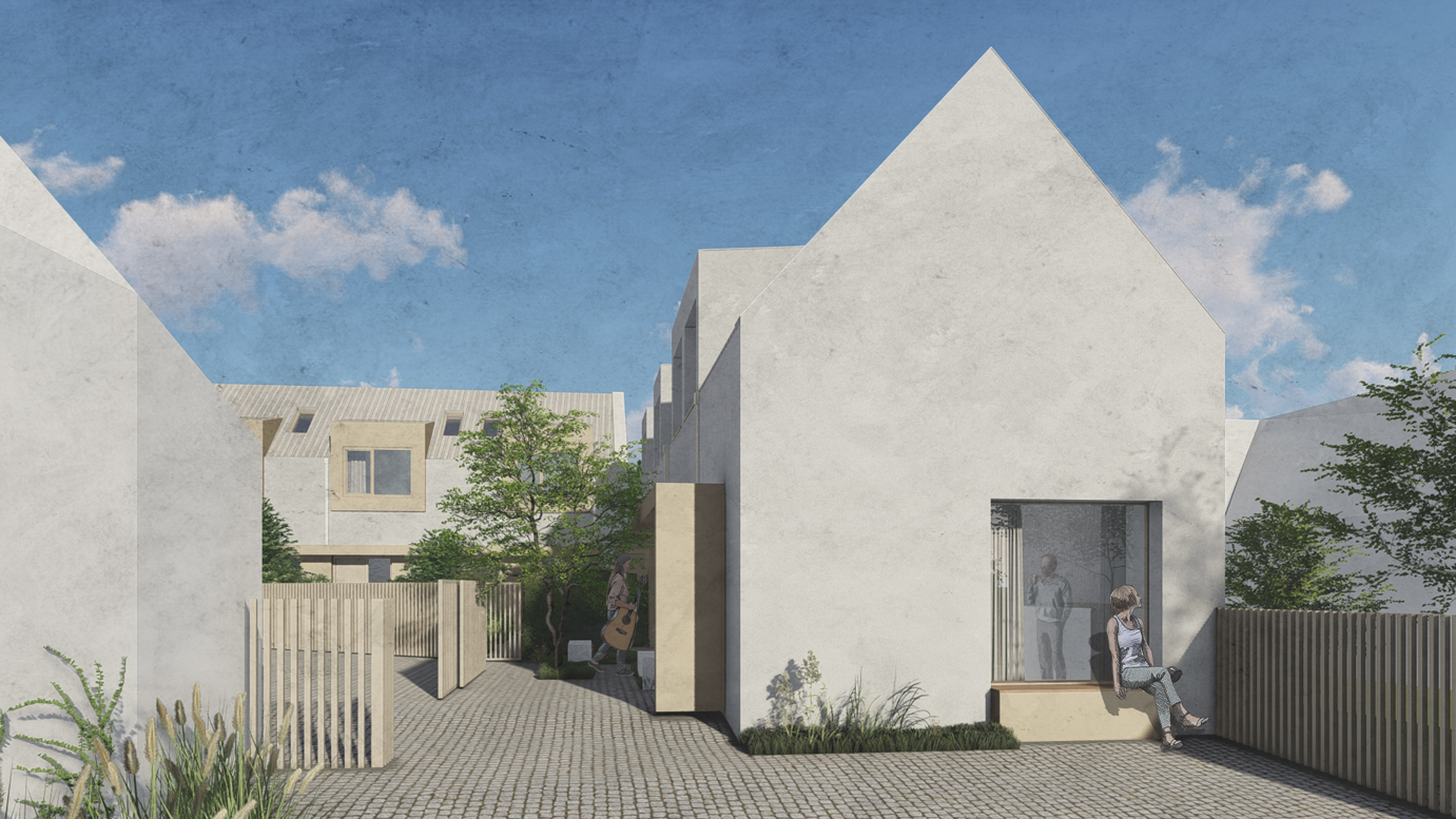 minimal white gable house in a narrow european courtyard soft evening light long shadows subtle warm glow from interior emphasize depth through layered foreground plants fence midground figure entry and background second building use realistic materials stucco texture wood slats stone paving cinematic composition shallow depth of field global illumination ambient occlusion slight lens distortion atmospheric haze high dynamic range architectural photography style 50mm lens