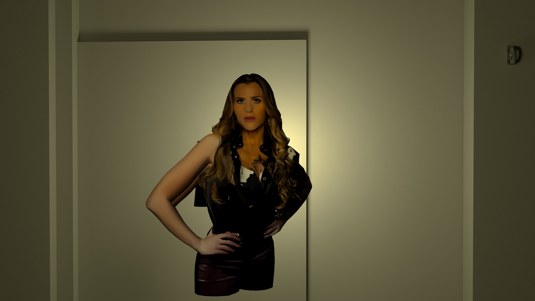 put more texture in back grey wall the light are yellow and is on night in a tv show with fog