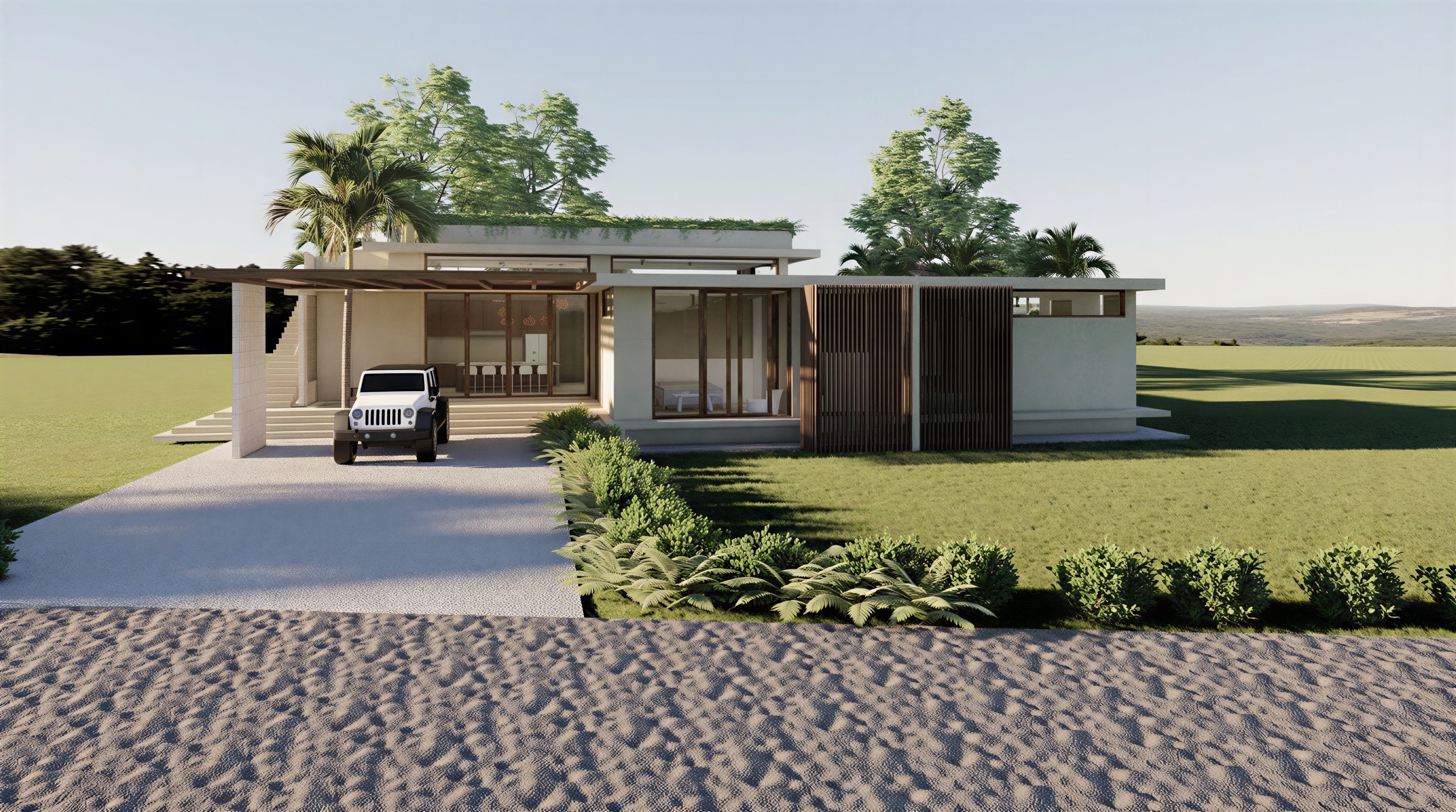 modern house with sleek design surrounded by lush greenery the house exterior is a mix of soft beige and white with large glass windows framed by elegant dark brown wood the driveway is made of smooth light grey stone leading to a white suv palm trees and other tropical plants enhance the front yard with various shades of green the atmosphere is peaceful and serene under a clear blue sky with soft sunlight casting gentle shadows providing a warm and inviting ambiance