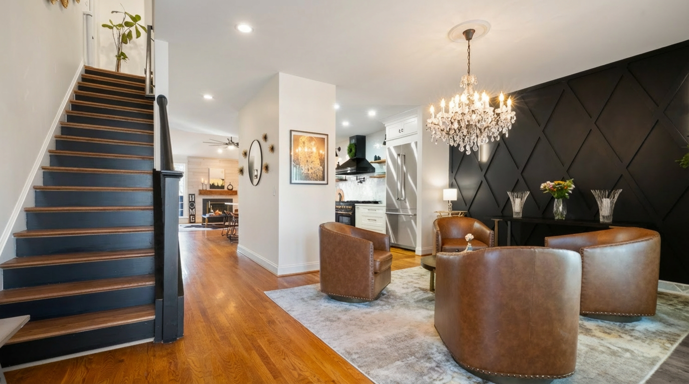 make this look realistic keep color the same the opening is looking into hallway add pendants over island add modern white crawford ceiling