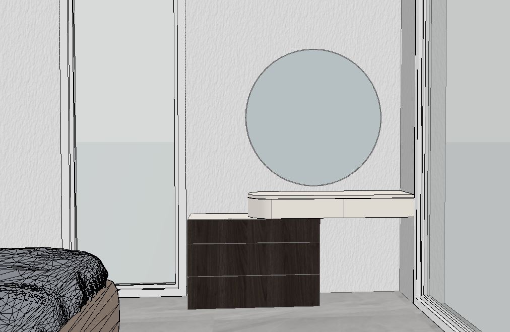 add a small chair for make up at the part of table that has the place and add one or two makeup brushes and a bottel of parfume at the mirror part add some soft led behind at the windows add a view from the first floor