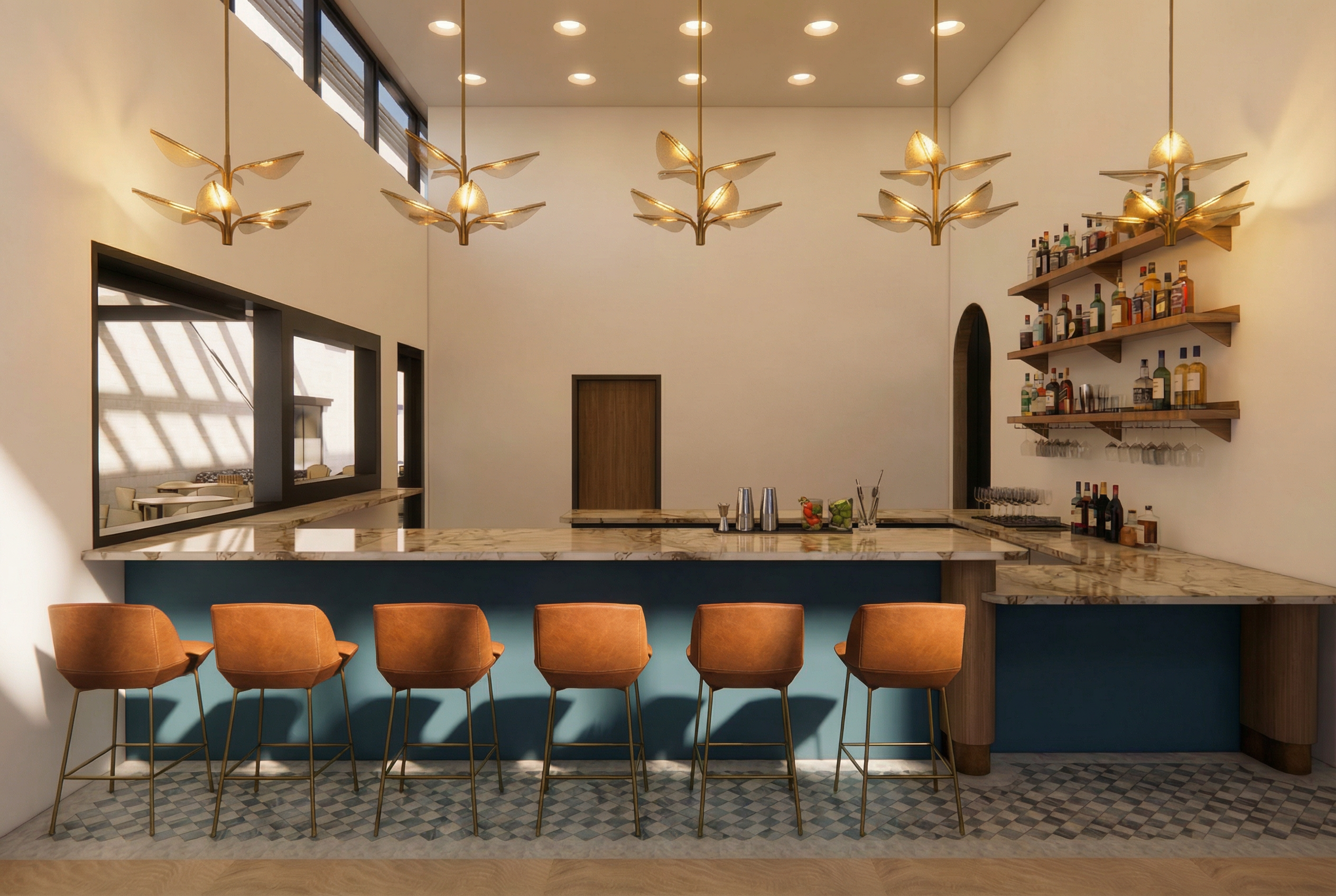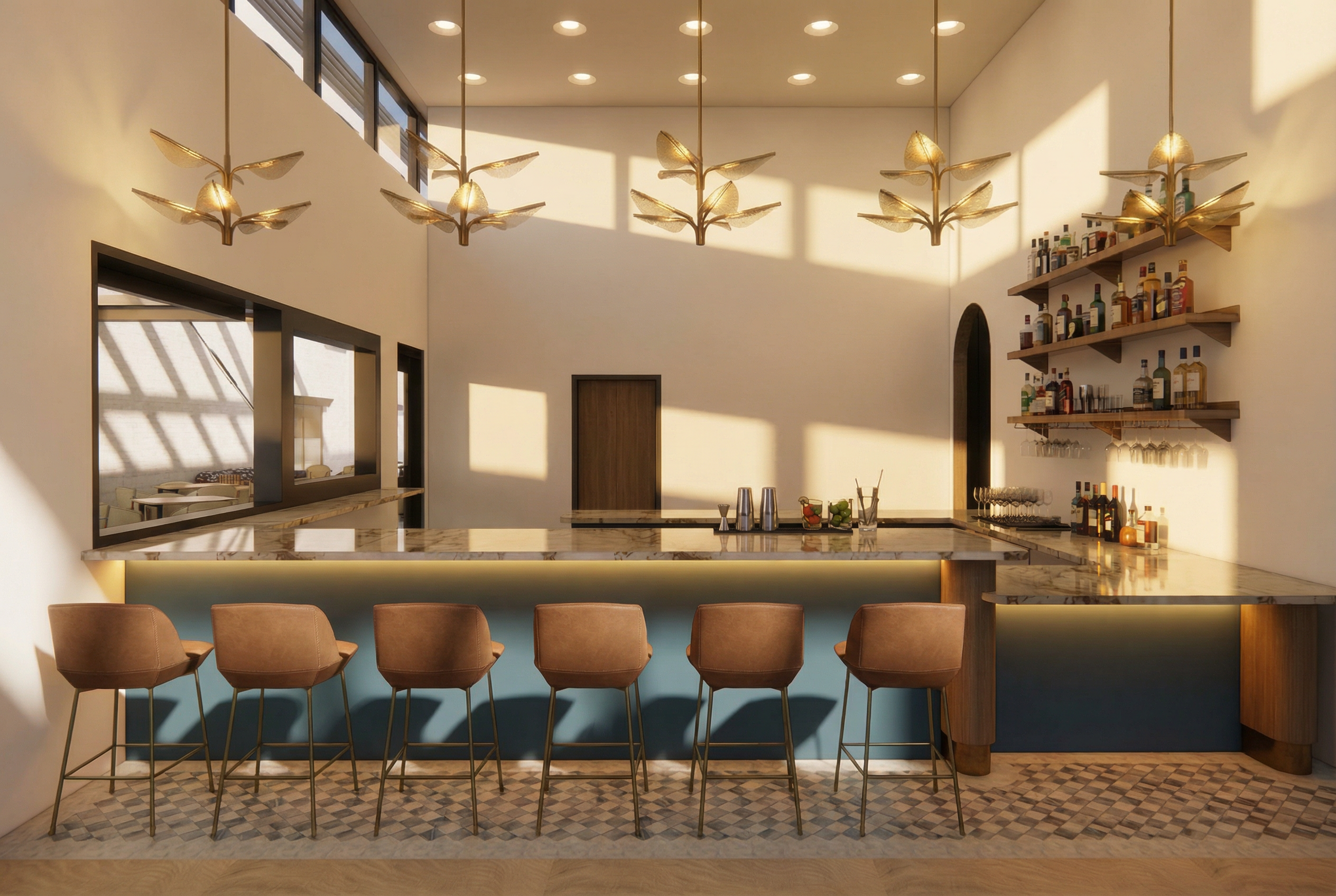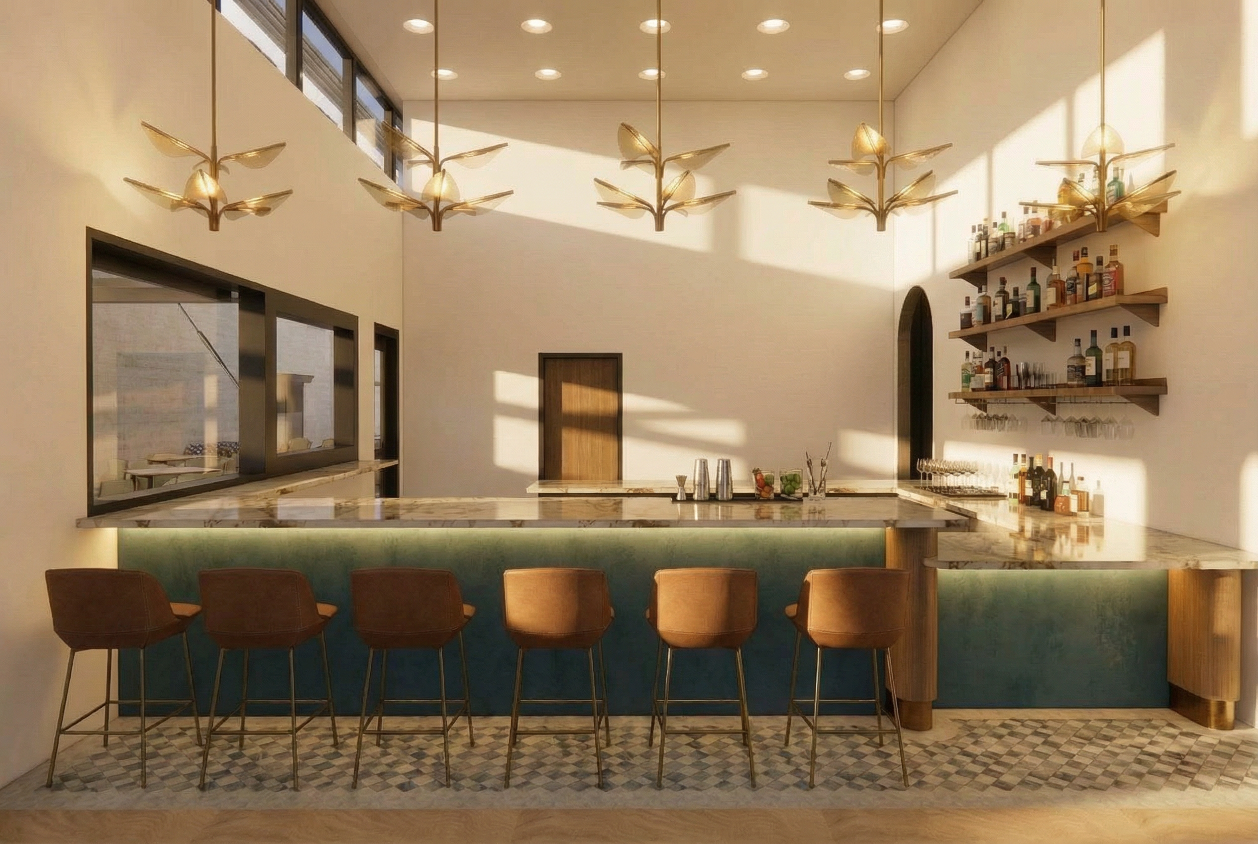 render this as a high quality head on elevation visualization the building geometry proportions fa ade composition windows brick textures greenhouse bays structure vegetation and roof rhythm must remain exactly as modeled no form alterations additions or removals style atmosphere soft pale daylight slightly overcast but bright calm neutral tones lightly desaturated gentle atmospheric haze to push background depth warm translucent glow through greenhouse glazing material intent brick base should read as adaptive reuse slightly weathered but realistic not stylized greenhouse fa ade translucent and matte subtle interior glow no mirror reflections vertical vegetation remains as modeled realistic distribution and shading context instructions keep the foreground sidewalk minimal and clean only add traditional acorn street lamps along the sidewalk no benches planters or other street furniture unless already modeled maintain your simple city background faint skyline silhouettes dissolved in haze not detailed composition rendering notes true front elevation no perspective distortion thin clean line definition along roof and fa ade edges high resolution with soft edges for vegetation light atmospheric depth subtle fog near horizon ground plane quiet and understated overall mood contemporary adaptive reuse district calm poetic and slightly cinematic architectural clarity first ambiance second