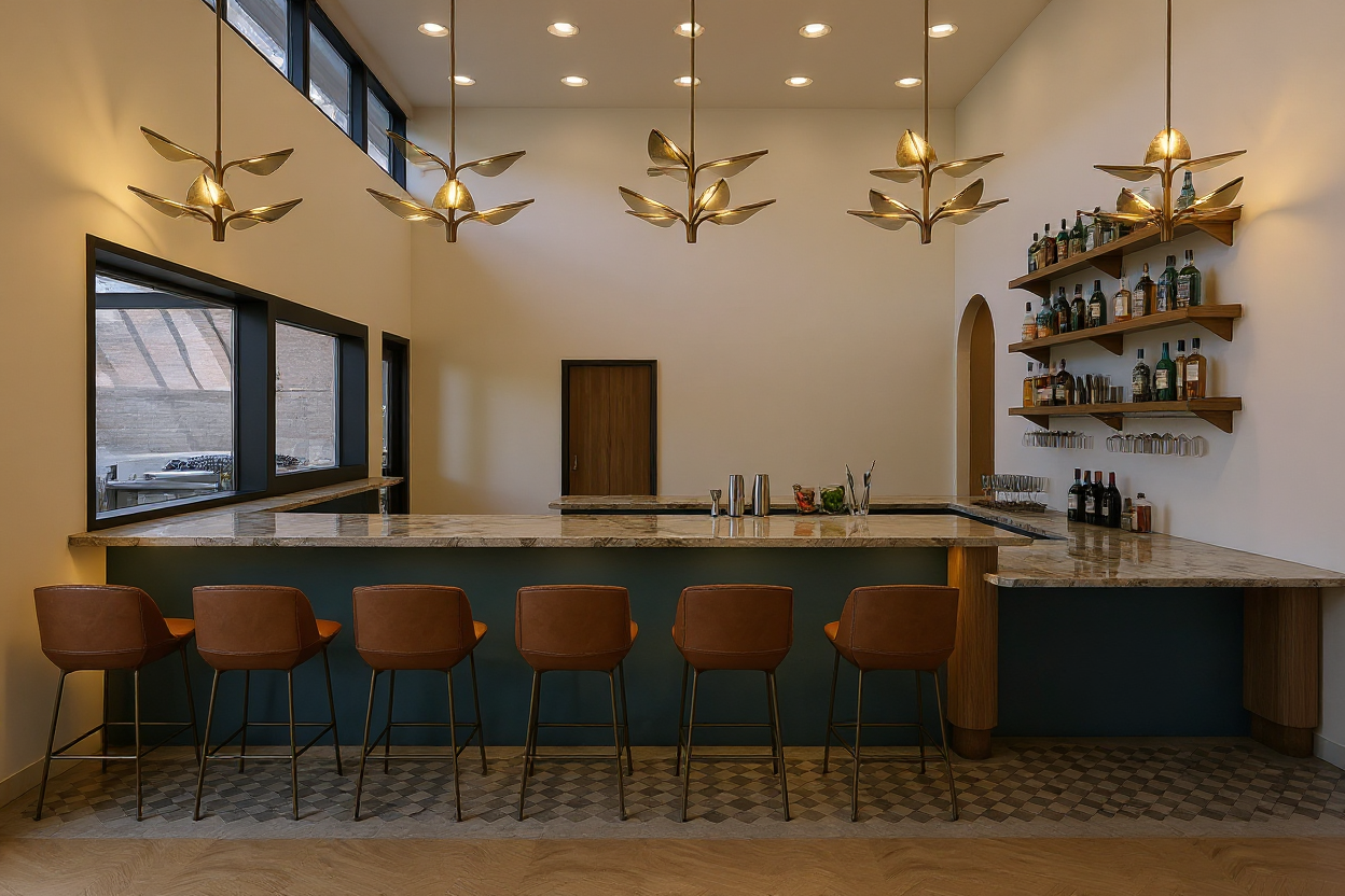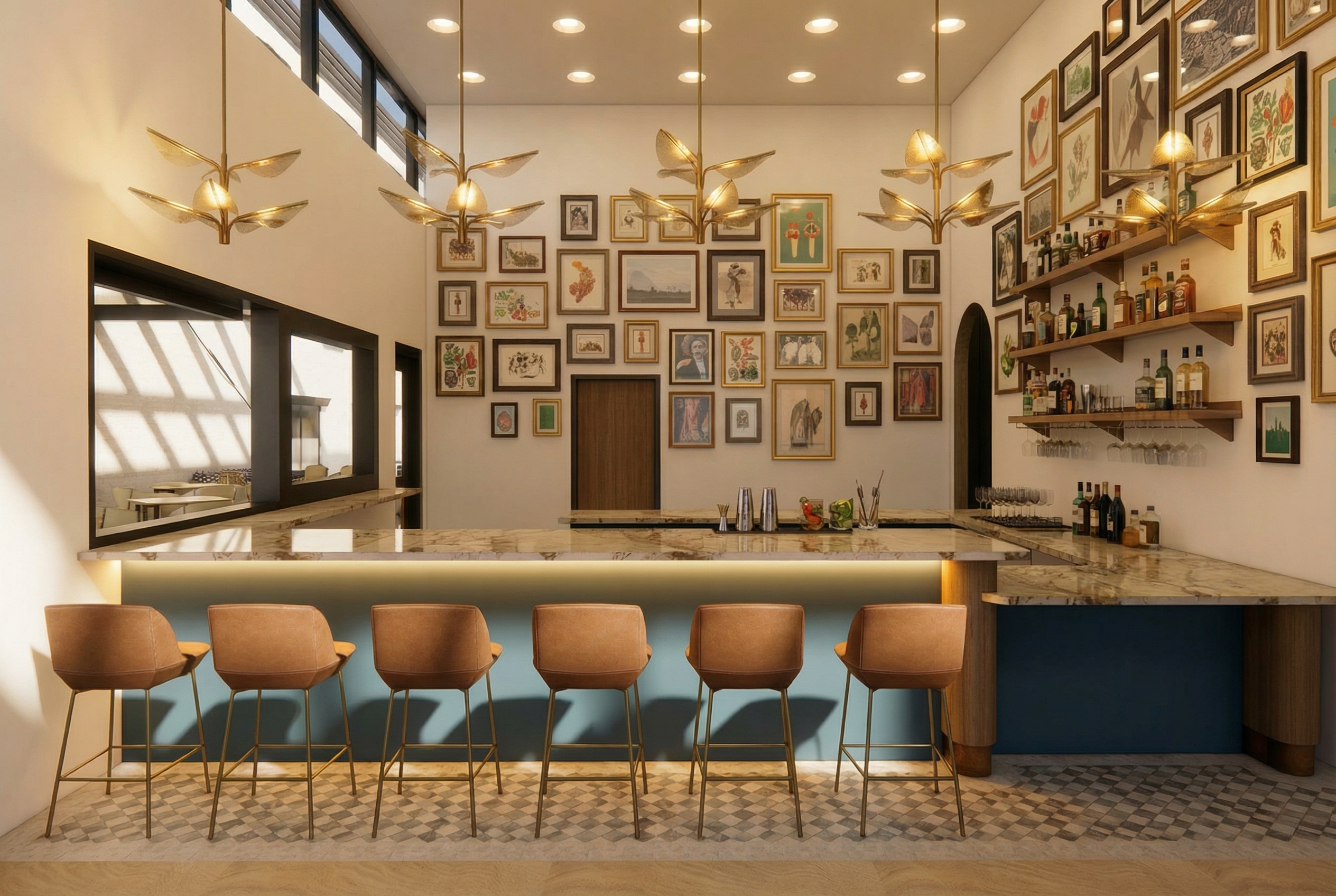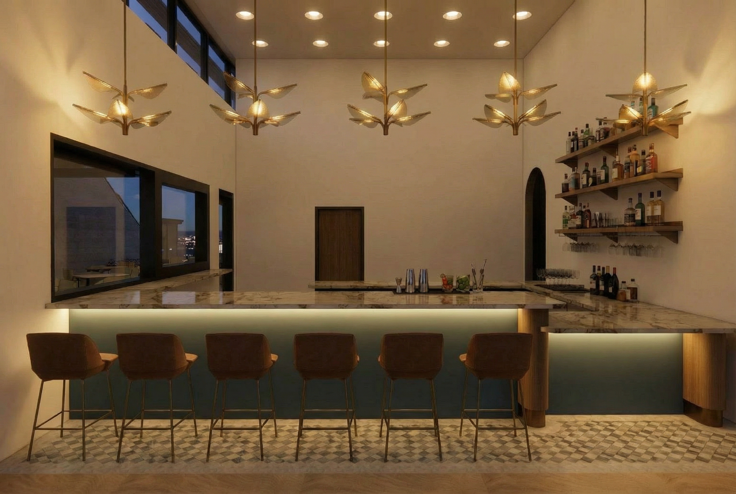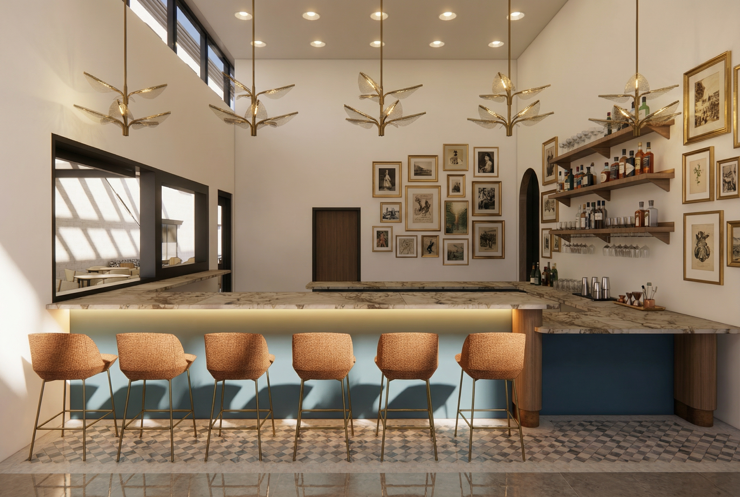 render this as a high quality head on elevation visualization the building geometry proportions fa ade composition windows brick textures greenhouse bays structure vegetation and roof rhythm must remain exactly as modeled no form alterations additions or removals style atmosphere soft pale daylight slightly overcast but bright calm neutral tones lightly desaturated gentle atmospheric haze to push background depth warm translucent glow through greenhouse glazing material intent brick base should read as adaptive reuse slightly weathered but realistic not stylized greenhouse fa ade translucent and matte subtle interior glow no mirror reflections vertical vegetation remains as modeled realistic distribution and shading context instructions keep the foreground sidewalk minimal and clean only add traditional acorn street lamps along the sidewalk no benches planters or other street furniture unless already modeled maintain your simple city background faint skyline silhouettes dissolved in haze not detailed composition rendering notes true front elevation no perspective distortion thin clean line definition along roof and fa ade edges high resolution with soft edges for vegetation light atmospheric depth subtle fog near horizon ground plane quiet and understated overall mood contemporary adaptive reuse district calm poetic and slightly cinematic architectural clarity first ambiance second