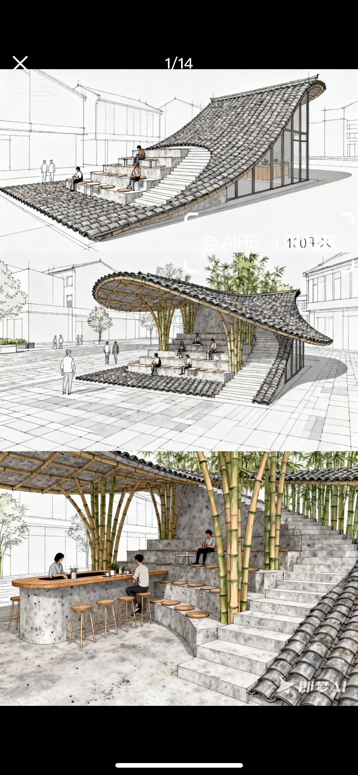 bobby mcalpine perspective shot render this to make it seem more realistic keep the materials as wooden and nature style make the roof very abstract looking with a chinese traditional architectural style add more open space area and void add more greenery architecture