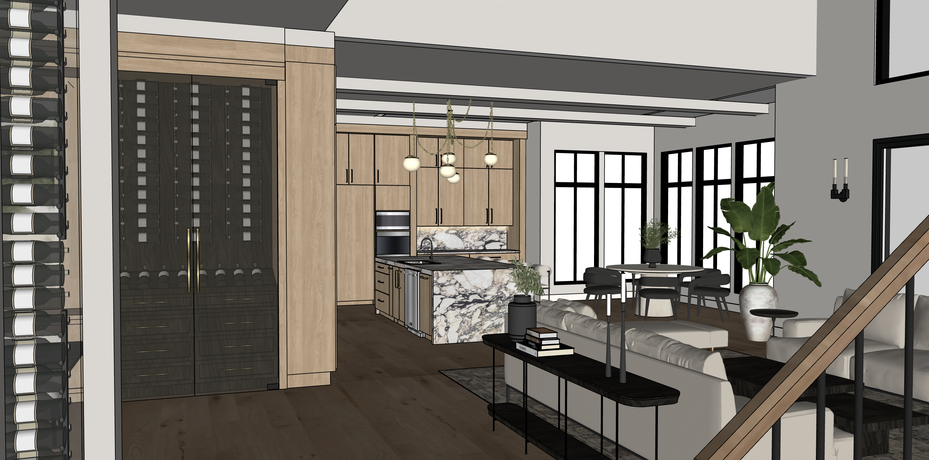 lighter white oak wood windows look out at landscaped back yard wine cabinet on left in black wood light up wine bottle more with brass hardware glass doors over cabinet
