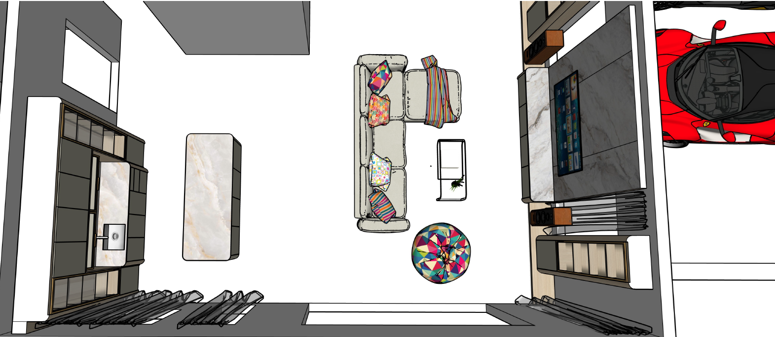 from top view of the living room additional light cove and spot down light on ceiling enhance the brightness of the space day sun light from outside top bottom island cabinet with led strip display cabinet with some wine liquors on right of the display is white bedroom door