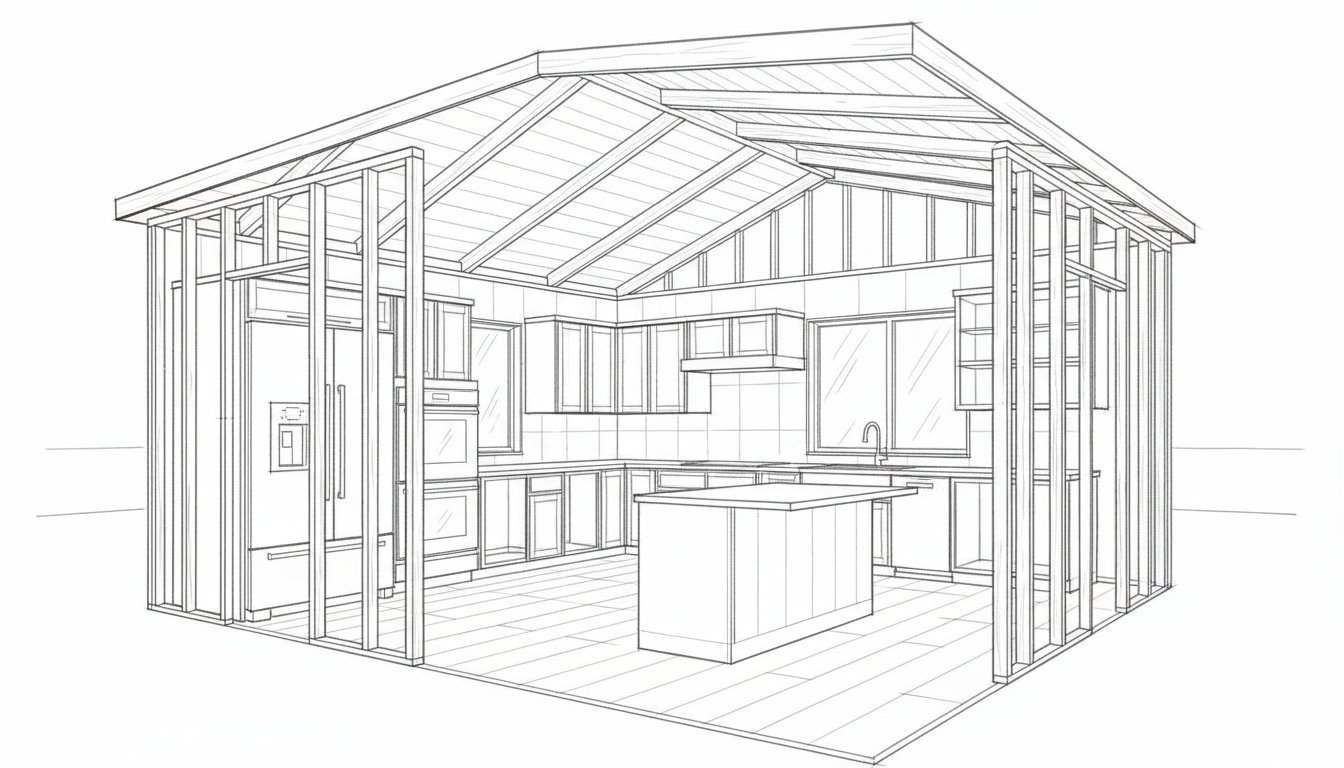 matte raw walnut cabinetry taupe quartz stone countertops white tiled backsplash thick plastered hood and walls open oak shelves gun metal plumbing panel wood ready thick textured plastered ivory walls