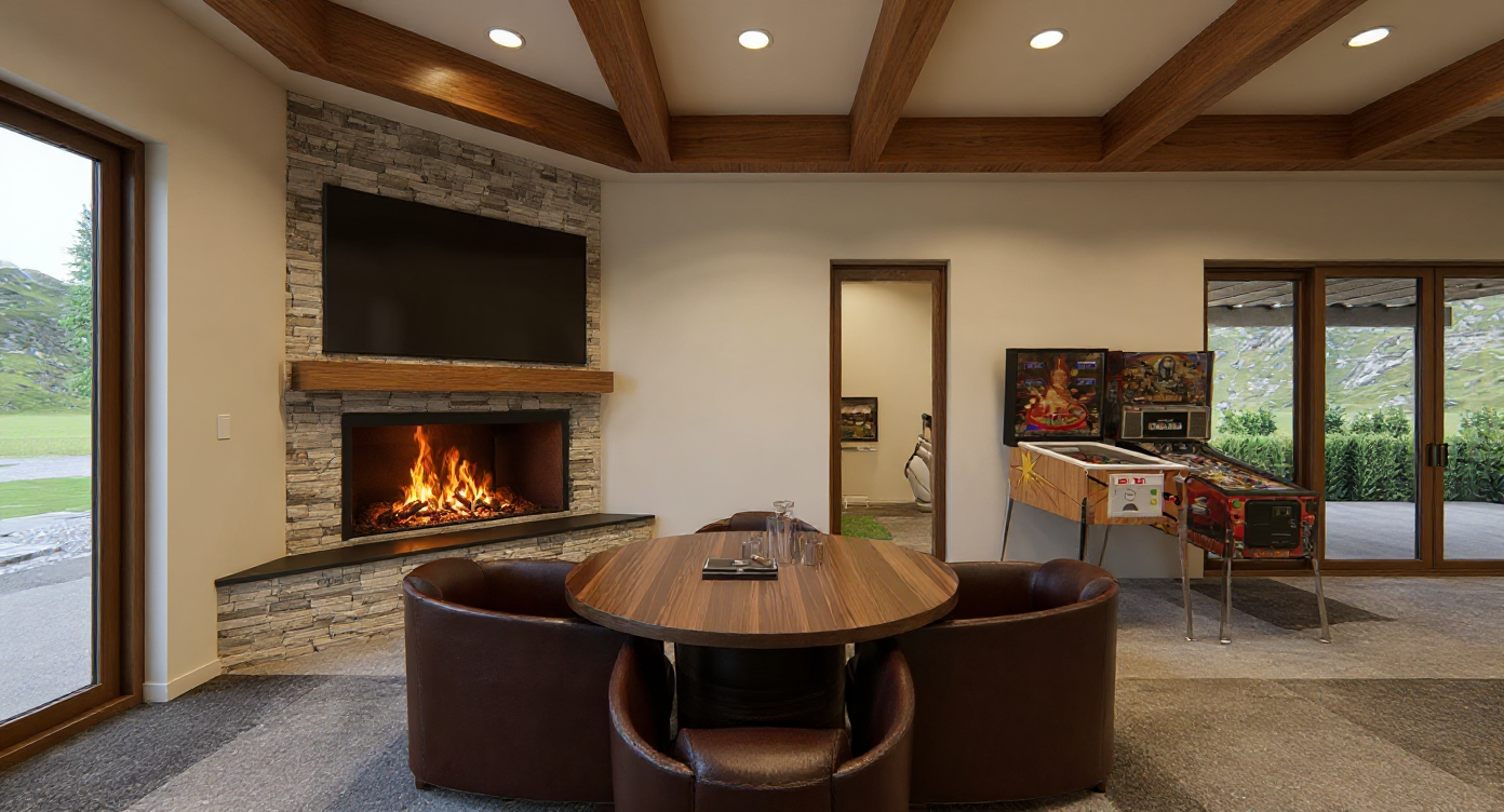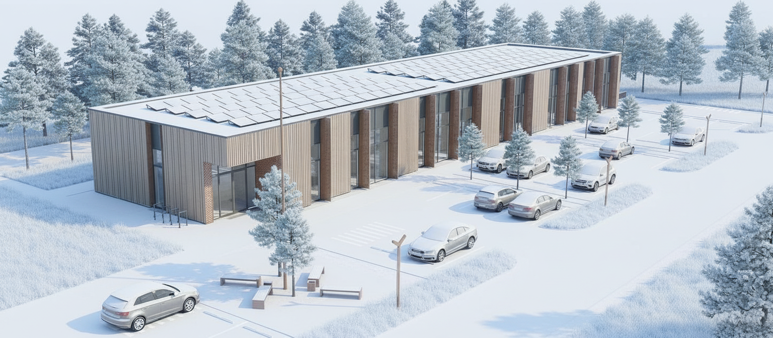 modernist exterior shot do not change the photo and keep everything as shown only add walking people on the sidewalks in the photos in the middle and on the left on the flagpole hang a non fluttering lithuanian flag architecture