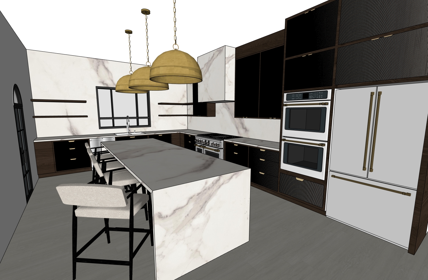 ultra realistic editorial interior photograph of a modern luxury kitchen architectural digest style natural dimensional lighting lighting soft directional daylight entering from left window at a 45 degree angle overcast sky but still directional subtle light falloff across island surface gentle shadow under island overhang and stools visible but soft shadow lines from pendant lights add realistic shadow depth not flat ambient lighting materials white marble island with honed finish and slight edge imperfections micro surface variation very subtle roughness dark walnut fluted cabinetry with visible grain movement and tonal variation no uniform coloring aged brushed brass with soft reflection and light patina add subtle reflectivity difference between materials no glossy showroom shine camera eye level at 4 6 35mm lens slight perspective depth foreground stool slightly out of focus back wall slightly softer than island exposure slightly underexposed overall 0 3 ev highlights controlled midtones slightly lifted shadows soft but present not crushed color grade warm neutral white balance around 4800k soft filmic contrast curve very subtle grain slight vignette extremely light styling one organic object ceramic bowl or wooden tray nothing centered perfectly natural asymmetry avoid flat global illumination look hdr perfect even lighting overexposed marble high clarity mood editorial depth soft but dimensional natural luxury photographed not rendered add recessed lighting not too much also add decor on shelves