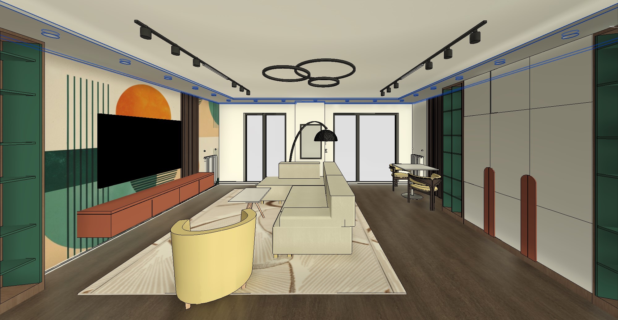 do not change the geometry and colors and materials the ceiling light fixtures should be turned on more daily light change the design of the armchair should be yellow its design can be made more modern and comfortable but it must remain with yellow upholstery the sofa located in the center should have green upholstery the green should be neutral earthy and slightly darker to create a calm and balanced look the coffee table should have a white marble top the windows there should be curtains it is important that nice natural daylight enters the space tv located on the central wall should appear more reflective glossier surface