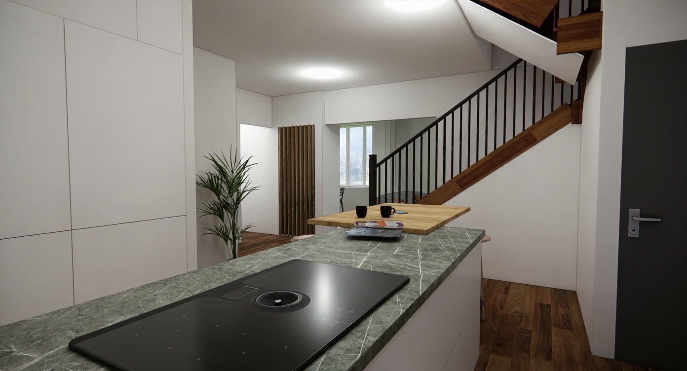 render this image with realistic materials keep room geometry exactly as in the input no modifications to openings windows or roof shape add light to the lamps in the ceiling and over the table do not add extra lamps or furniture transform the picture into a varm and nice office with cool designer stuff render this image with realistic materials keep geometry exactly as in the input make it look nordic cool no modifications to openings windows or roof shape material and lighting enhancement only preserve all shapes thicknesses and proportions make the interior window reveal out of polished and reflecting steel