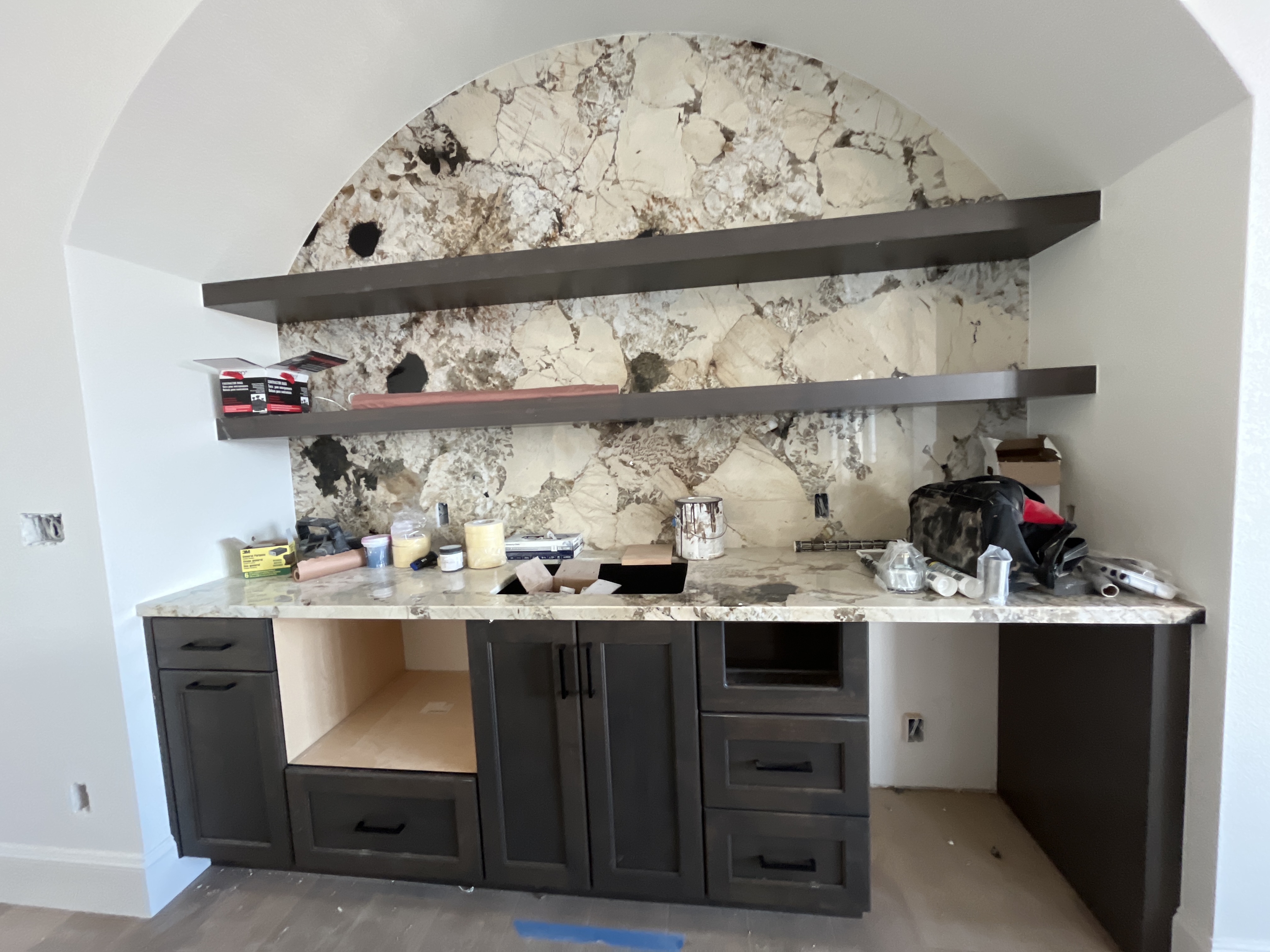 add an undercounter fridge in the opening on the right add a microwave in the base cabinet opening on the left stage the countertop and floating shelves for a bar and tidy up the floor to remove the tape