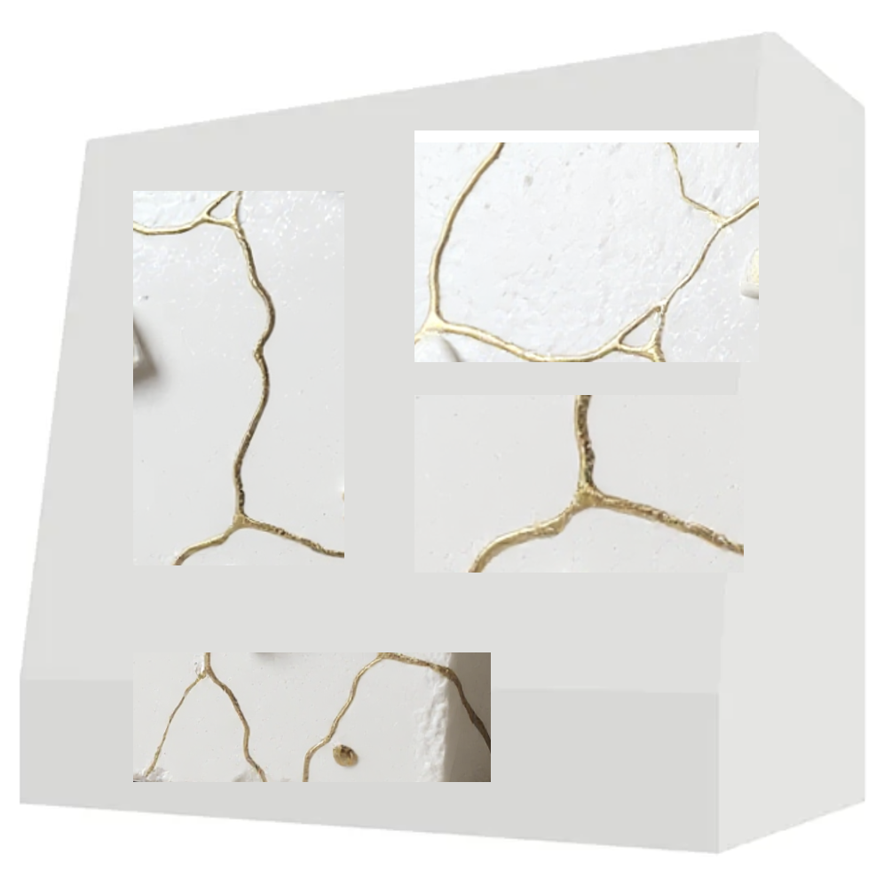 render the plaster kitchen hood with gold paint in a style of kintsugi