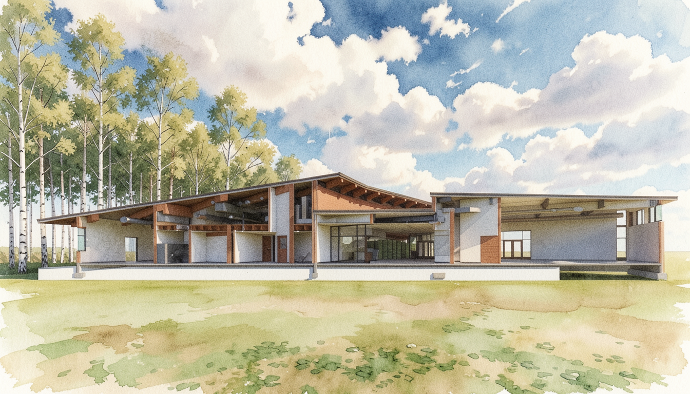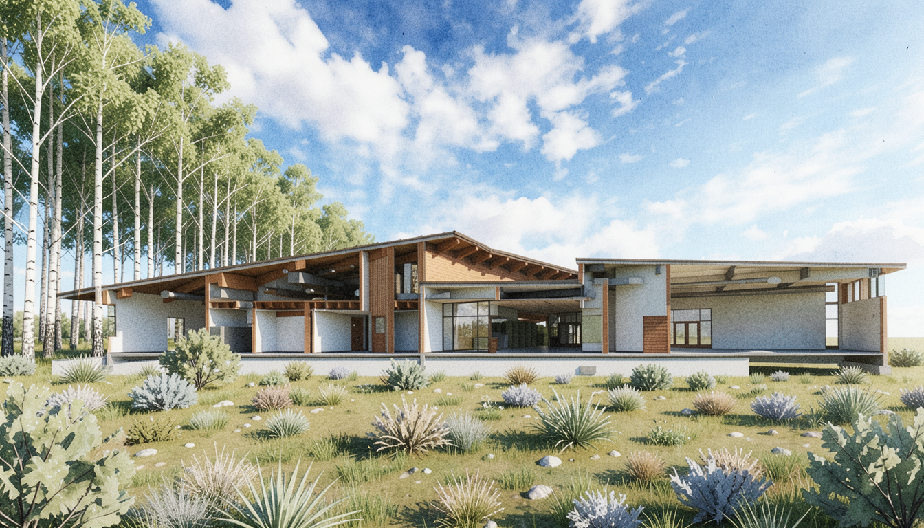retain perspective render a watercolor style 3d perspective of this situated section perspective library in gunnison colorado reference the current material style just enhance them place a row of cottonwood trees in background on the left side of the image and behind that that looks native to gunnison colorado they should only be about the same height of the building create dymanic sky with clouds do not change the view render