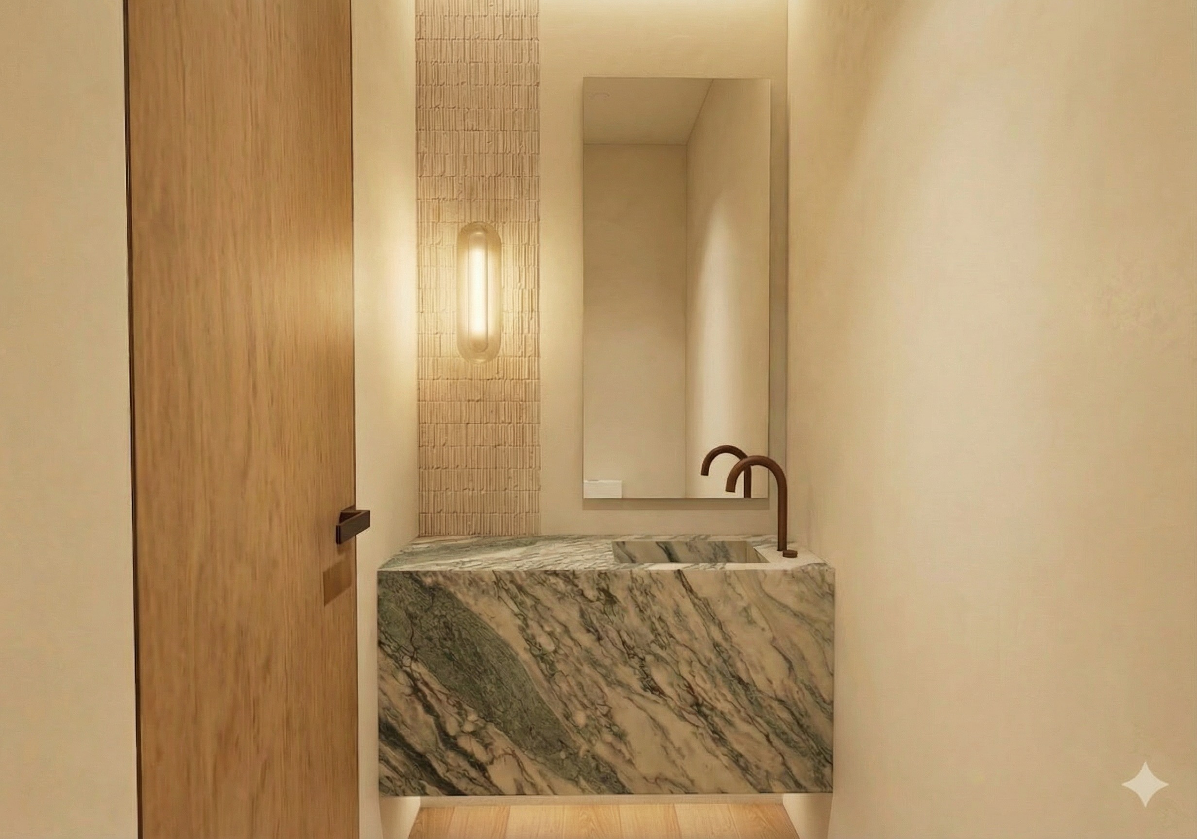 photorealistic interior render of a narrow modern powder room maintain exact geometry layout proportions and all existing materials from the model with no alterations walls finished in warm creamy off white roman clay plaster with subtle texture feature wall behind vanity clad in vertically stacked small format textured tile in a light neutral tone floating monolithic stone vanity in heavily veined marble with dramatic organic veining integrated rectangular sink no visible faucet fixture above the sink wall penetration only if present do not add or reinterpret faucet design tall narrow frameless borderless mirror mounted above vanity vertically aligned vertical sculptural wall sconce centered on tile feature wall with a rectangular stone or plaster backplate and slim dark metal side supports soft diffused glow warm color temperature 2700k minimal wood door with flat panel and dark hardware on left side light natural wood flooring with matte finish lighting is soft warm and moody powder room ambiance hidden recessed ceiling lighting not visible plus the single wall sconce as the primary visible light source no additional light fixtures emphasize soft shadows indirect lighting and realistic light falloff no overexposure no harsh highlights camera positioned at human eye level 5 ft straight on view centered on vanity tight space perspective with slight wide angle lens approx 24 28mm equivalent without distortion materials must appear highly realistic with accurate scale micro texture and subtle imperfections no added decor no styling objects no extra fixtures no redesign of any elements style high end architectural digest minimalist warm refined moody