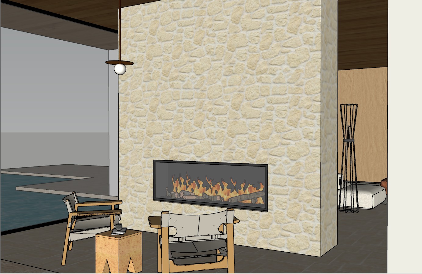 prompt photorealistic interior of a modern mediterranean villa in croatia based exactly on the provided reference image strict requirements keep the exact architectural layout proportions and camera angle do not change furniture design position scale or distribution do not add remove or rearrange any objects maintain the same composition and spatial relationships scene description a tall limestone feature wall with a horizontal built in fireplace centered on the wall natural irregular beige stone texture in front of it two wooden lounge chairs with light fabric cushions and a small wooden side table between them positioned exactly as in the reference on the left side an indoor outdoor pool with still water visible through an open wall maintaining the same placement and geometry ceiling with warm wooden panels and a single minimalist pendant light hanging down with a round bulb same position on the right side a partial view into a bedroom with a low bed and wooden wall panels identical framing and placement materials upgraded to photorealistic quality detailed limestone natural wood grain soft woven fabric realistic glass and water reflections lighting soft golden hour sunlight entering from the left side mixed with warm firelight and subtle interior ambient lighting physically accurate shadows and reflections style ultra realistic architectural visualization ray tracing global illumination 8k high dynamic range cinematic but natural camera fixed eye level perspective 35mm lens match original framing exactly no distortion mood calm warm luxurious croatian coastal villa negative prompt very important for control changing layout different furniture extra objects missing objects altered proportions redesign surreal stylized cartoon low detail distortion fisheye exaggerated perspective
