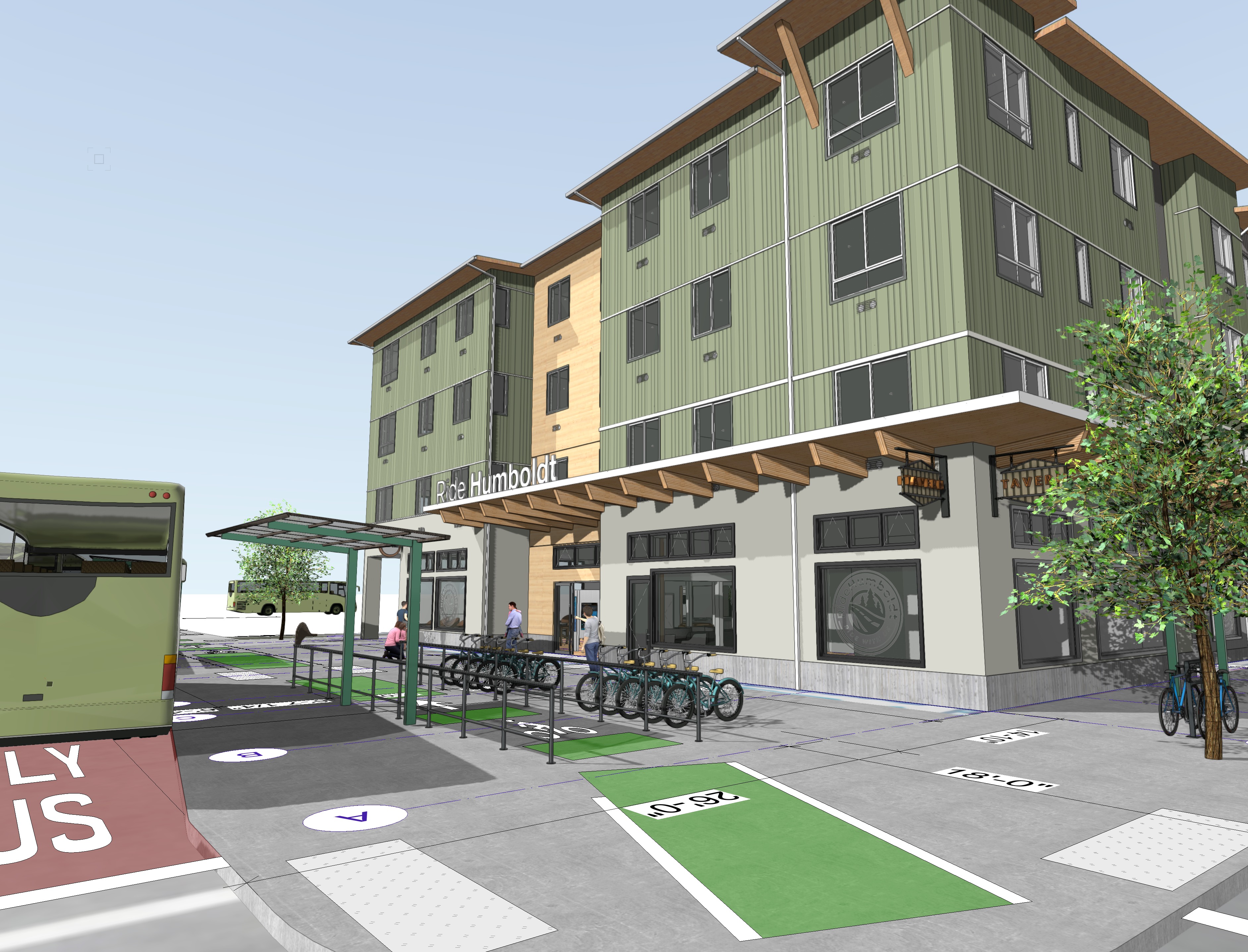 photo realistic scene at popular transit stop in old town eureka in the pacific northwest on sunny day green painted bike lane people waiting for bus under shelter