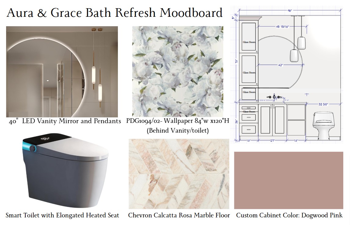 create a romantic luxurious bathroom with the semi circle lighted mirror beside the glass tower on top of the 60 vanity shown in the image
