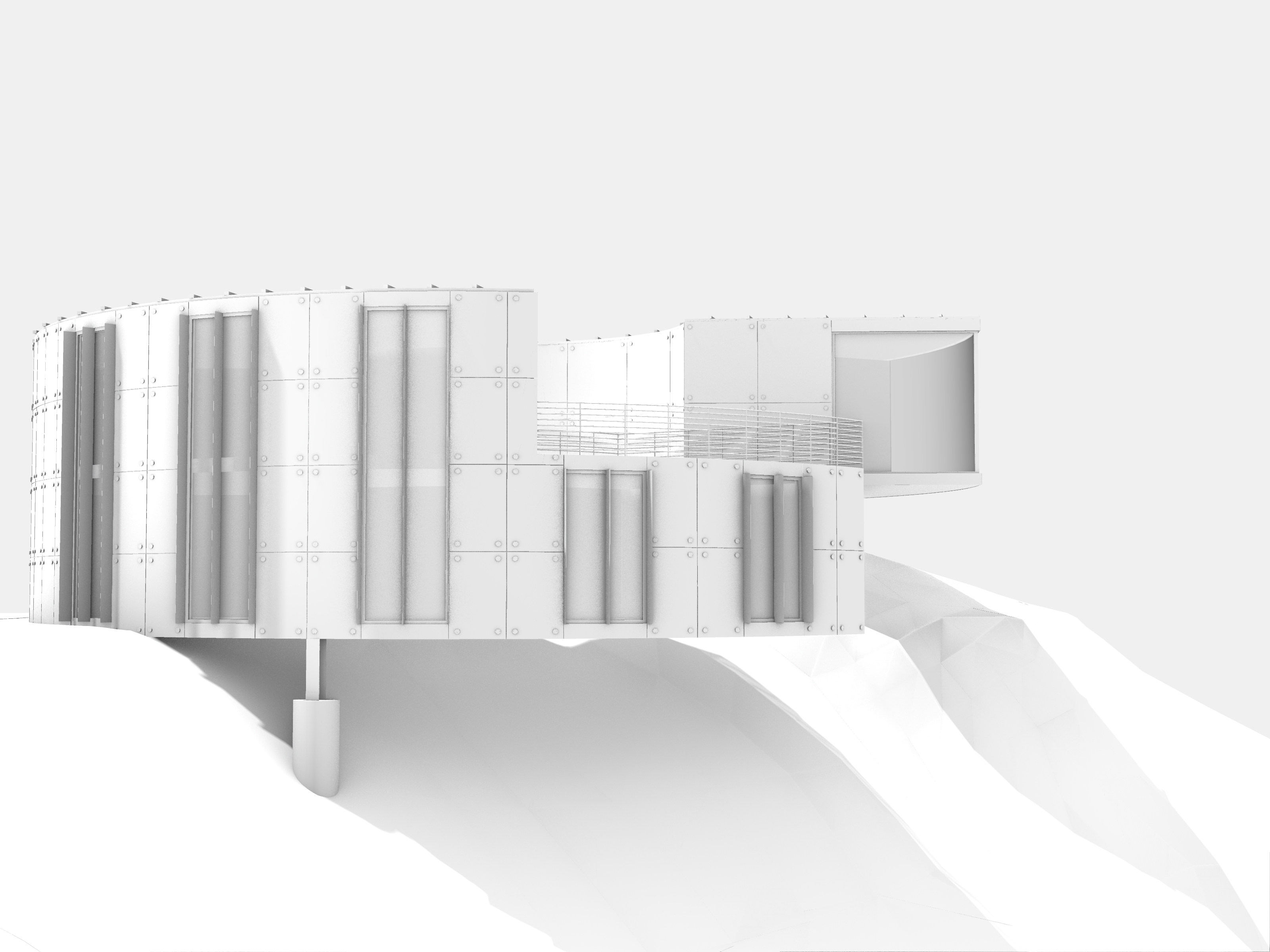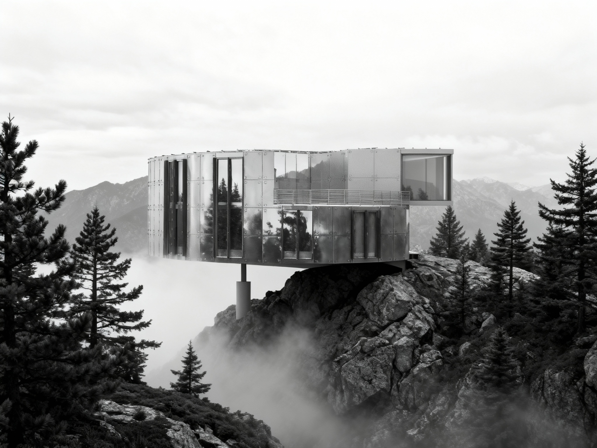 architectural realistic grayscale rendering of a small research station perched on a rocky terrain structure made of metal panels and mirrored reflective glass precise and realistic architectural detailing cantilevered over stone terrain supported by steel beams surrounded by mountain pines and mist below rendered with crisp building geometry and realistic materials background and edges dissolve into the mist edges not full bleed with soft unfinished fade around the image soft ambient lighting overcast sky moody grayscale rendering high detail model aesthetic conceptual design architecture studio presentation style
