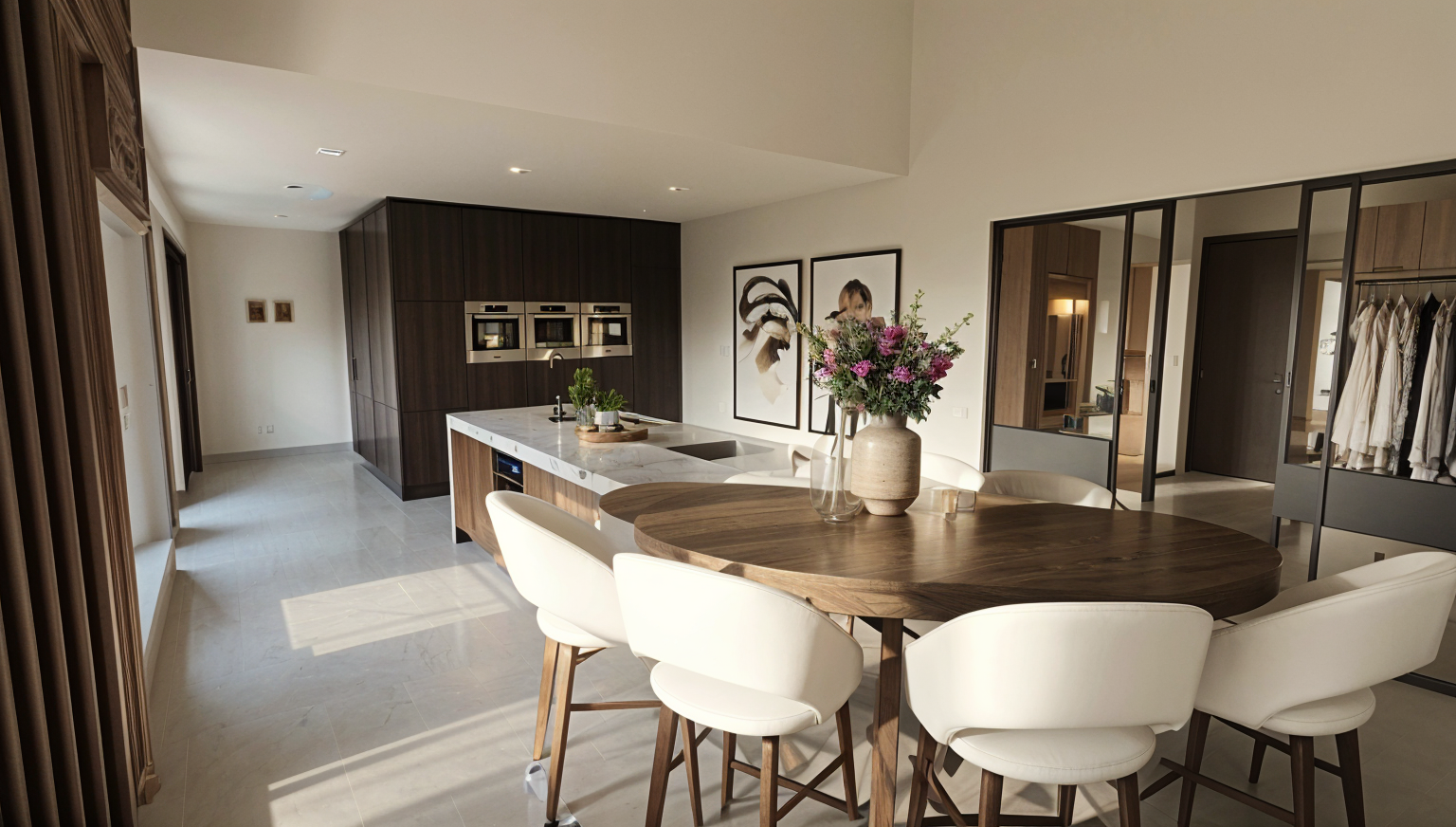 a modern kitchen interior featuring sleek cabinetry in dark wood tones and polished stone countertops with a subtle marble pattern the kitchen island has a rich wooden top and is surrounded by elegant bar stools upholstered in cream fabric the flooring is a smooth concrete gray complementing the neutral color scheme adorning the wall are two abstract paintings with bold black and white designs include a vase filled with a bouquet of deep autumnal colors like burgundy and olive green the atmosphere should be warm and inviting with soft natural lighting creating a cozy ambiance keep the ovens black