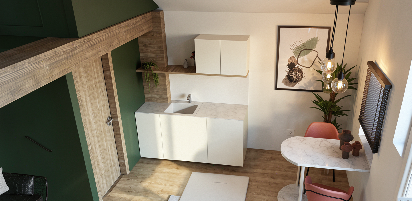 make the floor light grey concrete make the brown woodwork flat no decorative frame on it