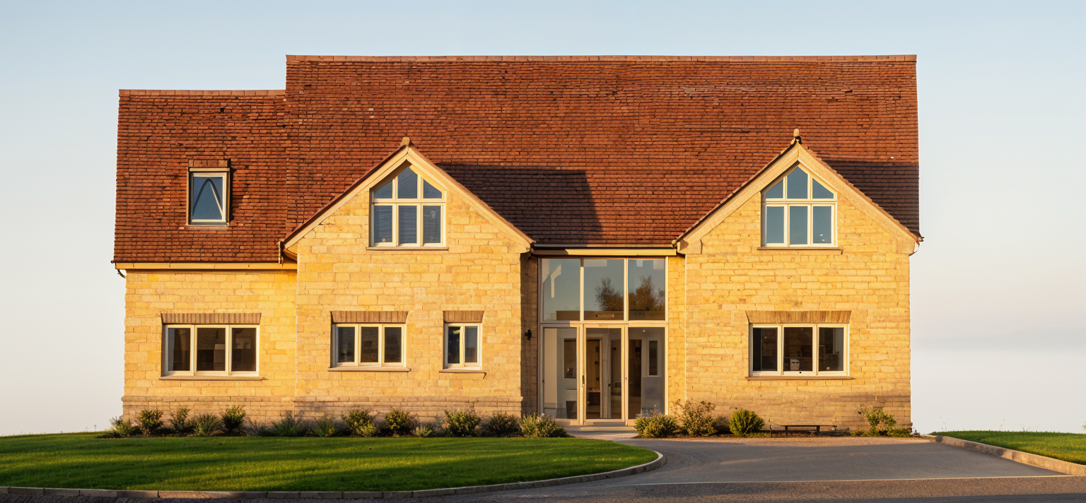 create a cgi rendered image of this house add basic low level grass landscaping and front driveway for the red bricks use a brick that looks like audley antique bricks and for the yellow bricks use a brick that looks like wienerberger st ives cream rustica for the roof tiles make them marley acme tile double camber in antique and the upvc windows should be a light sand cream colour