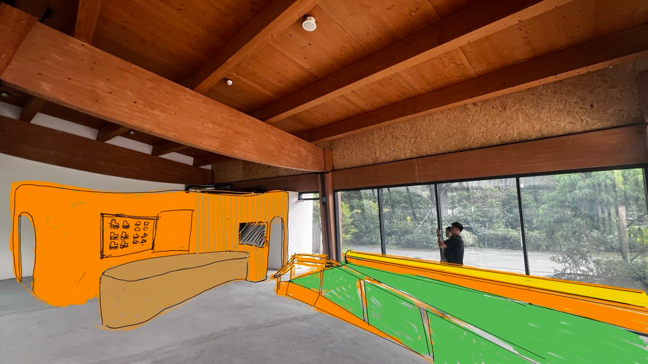 interior shot i need a realistic render with the drawings in the photo use drawing in picture as reference the picture is a space that is needed for skate school the design should be biophilic with lightings that has plants and sufficient visuals there are hanging lights with plants on them left side of image is a drawing of a counter of a skating school for registration on the curved wall is a skate display hanging different skates from children skates to adult it also has advertising posters of the school with pictures of children skating and a vertical tv screen near the door to show the activities of the day the wall has wooden fluted panels design on them the counter is a large organic shape with a computer on it for administration the design is elegant luxurious wood on the right side is a ramp with artifical grass turf on it with railings on the side near the window is a cusioned setee with storage below architecture