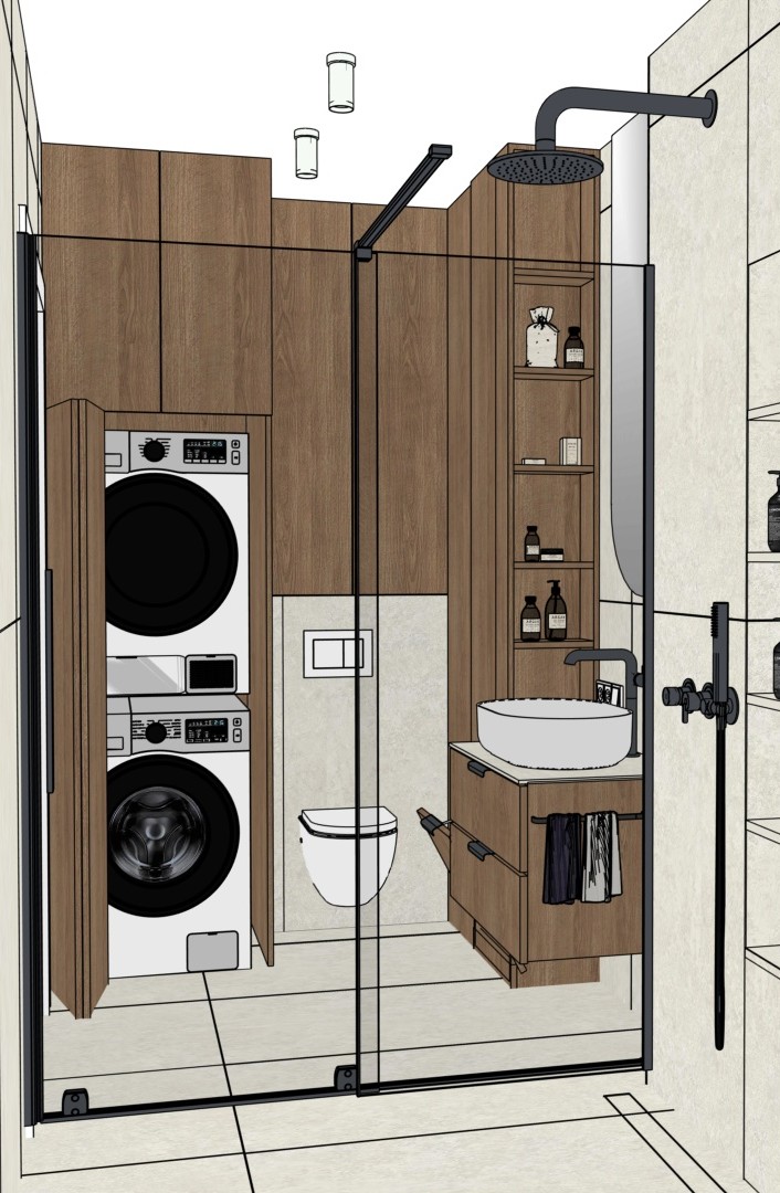 light the interior like a cloudy day transform your bathroom design photo into a hyper realistic architectural visualization of a contemporary modern bathroom preserve the exact geometry layout proportions and materials of the original design lighting create an atmosphere of soft cloudy daylight reminiscent of a cloudy rainy day without visible rain with diffused natural light maintain balanced contrast avoiding harsh shadows and highlights materials and textures enhance the realism of materials micro details surface imperfections soft reflections precise roughness and a physically correct response to light highlight textures light walnut wood grain light beige tiles metal and matte finishes high micro contrast and tangible depth the color of the fixtures and shower enclosure is gray the mirror reveals the tiled wall and smooth white door a white countertop under the sink two round wall lamps to the right of the mirror with the light on led lighting behind the mirror rendering style ultra photorealistic architectural visualization cinematic quality natural color grading neutral tones soft highlights realistic global illumination physically based rendering high dynamic range premium interior photography camera and composition wide angle architectural lens natural perspective eye level view deep focus sharp details throughout the frame natural framing no distortion ambience calm elegant contemporary upscale residential atmosphere clean minimalist sophisticated and free from visual noise output 8k resolution ultra detailed noise free sharp edges professional quality architectural rendering white sockets no additional led lighting negative cues no raindrops lens flare fog haze blur cartoonishness styling over sharpening artificial glare unrealistic reflections distortion clutter led lighting windows concrete led lighting in cabinets