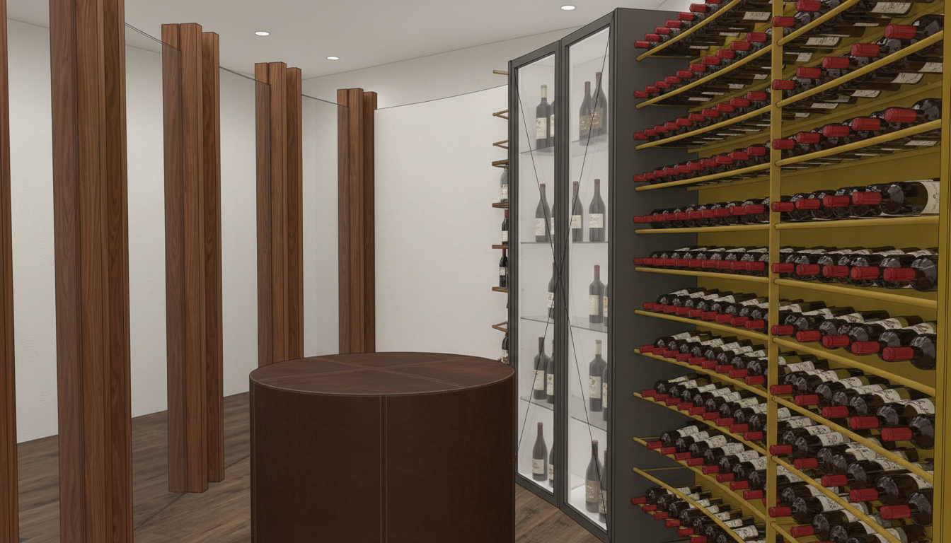 marble pillars from andeer central table with bottle and glass decoration wardrobe with brass frame wooden doors illuminated shelves interior of wardrobe in burnished brass include 2 people drinking at the table illuminated bottle shelves mirrored ceiling architecture