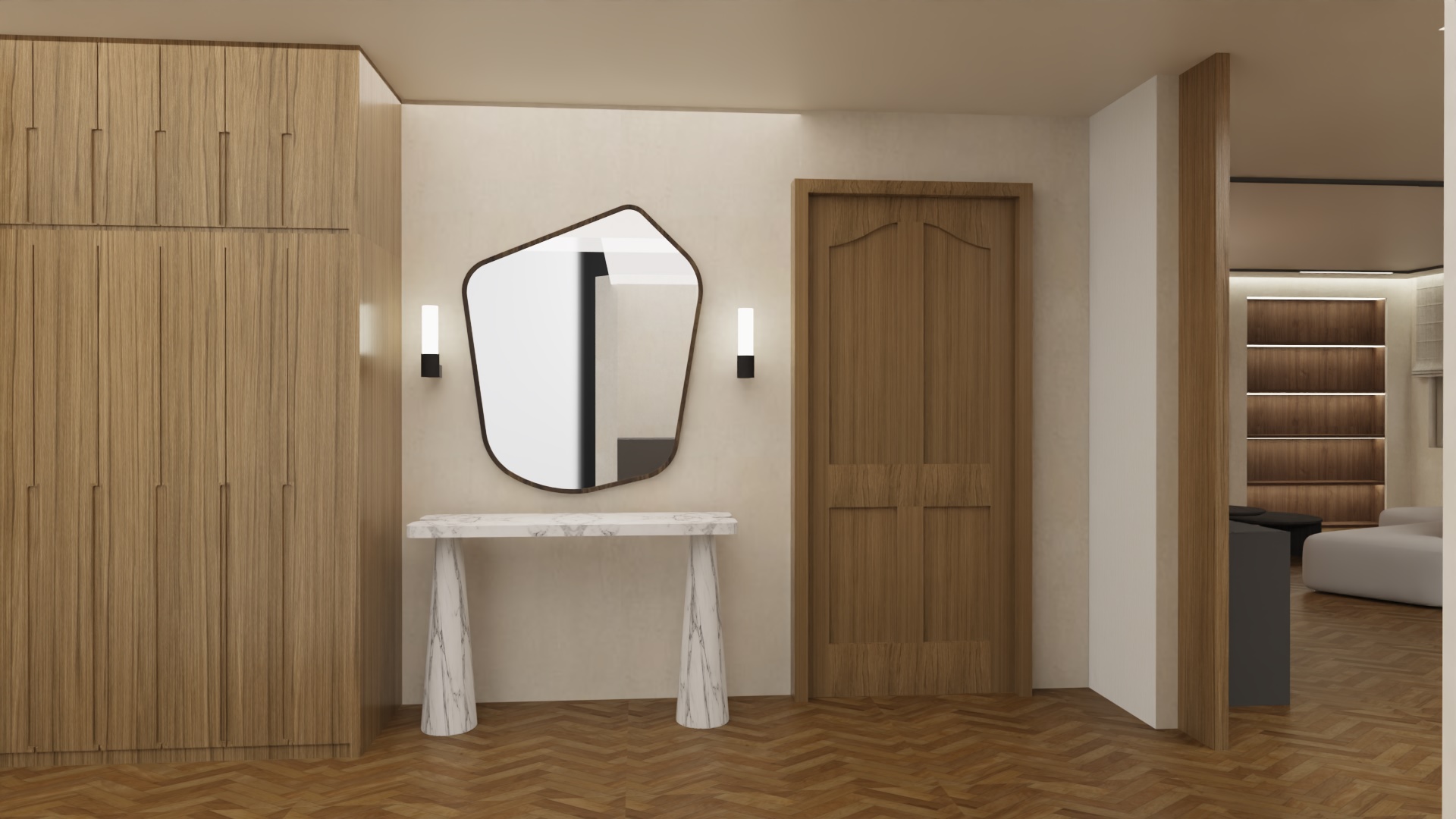 ultra photorealistic 3d interior image based strictly on the uploaded reference image maintain with absolute accuracy the exact same camera angle framing and perspective all architectural elements geometry proportions materials textures colors furniture d cor finishes and object placement artificial lighting fixtures and their design no additions or removals do not alter layout styling materials or design intent in any way enhance the scene only by introducing realistic natural residential mediterranean daylight entering through the existing windows soft diffused mediterranean light with a cozy atmosphere balanced daylight tones combined with light interior ambience natural shadows realistic light gradients accurate reflections and true to life exposure photographic realism real life interior photography quality high detail physically accurate lighting no stylization no cgi look ultra photorealistic 3d interior image based strictly on the uploaded reference image maintain with absolute accuracy the exact same camera angle framing and perspective all architectural elements geometry proportions materials textures colors furniture d cor finishes and object placement artificial lighting fixtures and their design no additions or removals no material changes no color shifts no added objects no removed objects no layout changes no stylized lighting no dramatic sunlight no overexposure no cinematic effects no artificial glow change wooden cabinets with minimal look