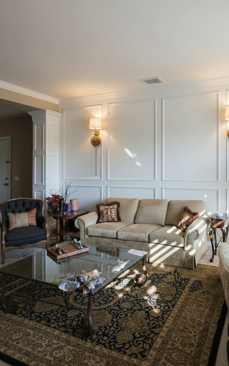 add wall panels same style as reference on corner of column also add wall panel along back wall behind couch maintain same colors furniture and light fixtures