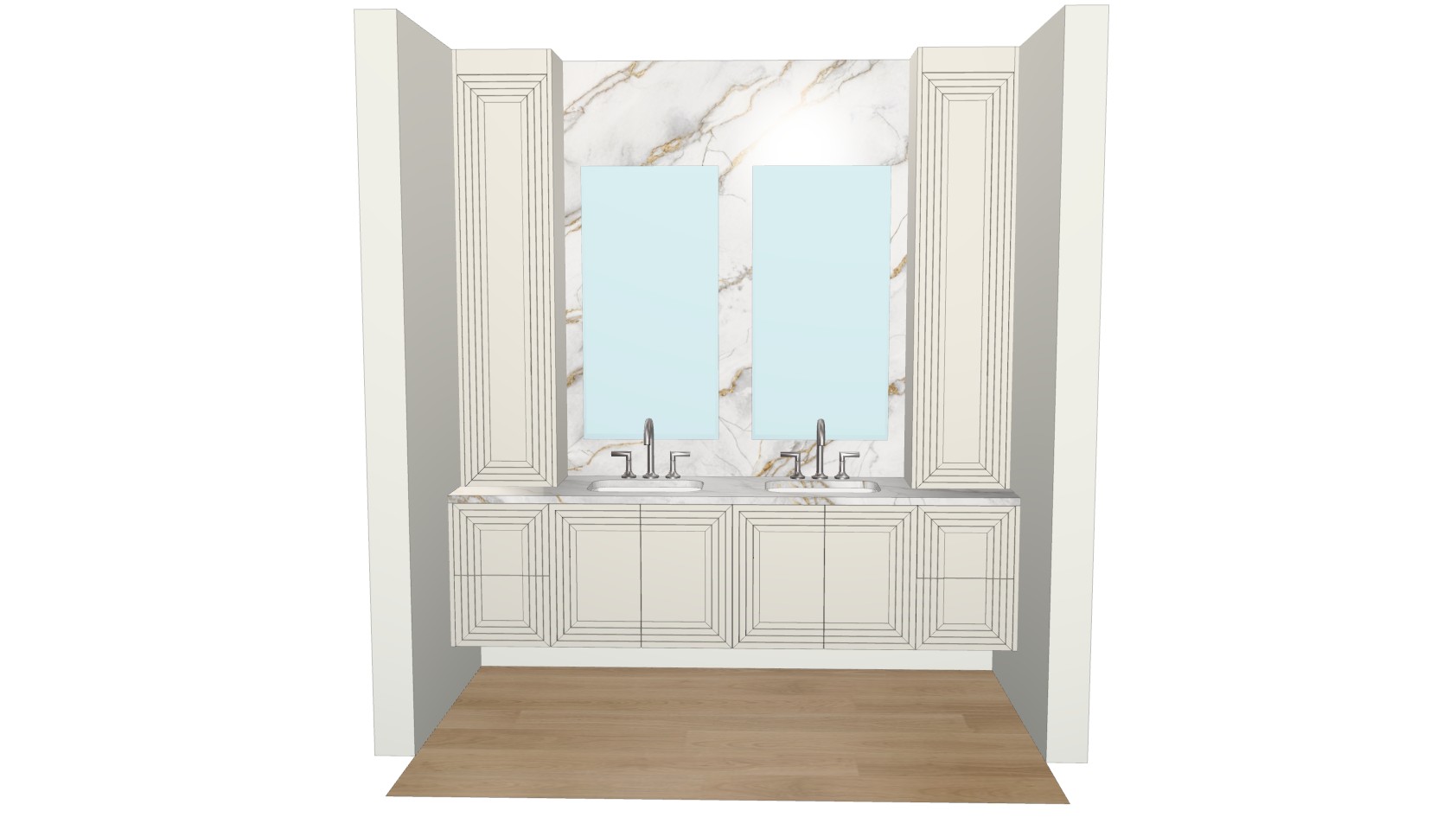 render a luxurious wardrobe with elegant cream colored doors and intricate fine lines in a light gray hue include a glass section with transparent shelves on the left side the wood flooring should be a rich natural oak color providing a warm atmosphere the walls are soft white to enhance the serene and sophisticated ambiance add soft ambient lighting that gently highlights the textures and details for a calm and inviting feel