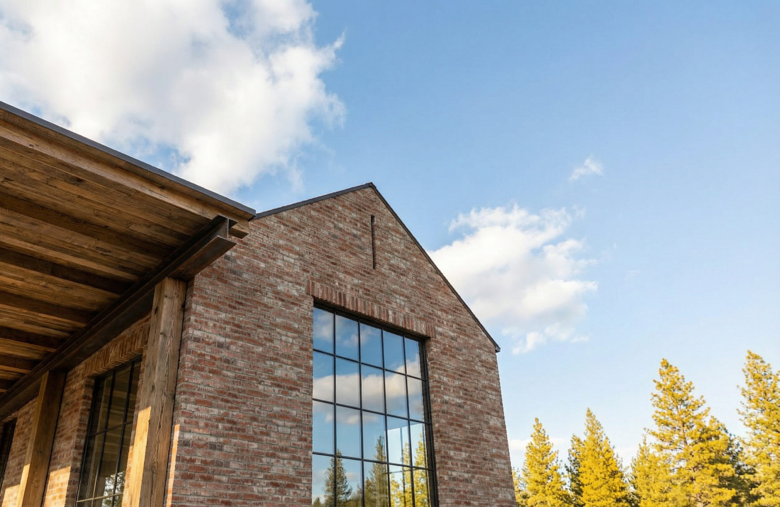 this is a material and entry modification only keep the original building design exactly the same use the base image and do not change the architecture roof shapes window sizes window locations or proportions make only the following changes entry stone add a full height vertical light beige limestone element centered on the main entrance the front door must be recessed into this stone element add a large stone arch directly over the front door at ground level the stone element must extend from ground to roofline do not add stone anywhere else on the house roof the entire main roof must be dark charcoal architectural shingles only no metal roofing on the main roof add a black standing seam metal canopy roof directly above the garage doors the canopy should be wide and substantial add a black standing seam metal canopy roof directly above the entry wood siding use vertical wood siding with narrow boards color should be dark warm grey brown stained wood natural cedar tone not orange and not light brown windows keep all windows exactly the same keep the tall double height living room windows do not show interior windows should be darker and slightly reflective driveway driveway should be uniform light grey cobblestone small stones consistent color no patchy texture and no large slabs lighting use soft evening light with warm exterior lights and visible shadows to create depth style high end mont tremblant luxury alpine home natural materials photorealistic do not do not change architecture do not change roof shape no metal roof on main roof no stone on garage no wide siding boards no orange wood siding no patchy driveway no visible interior do not redesign the house follow the original image very closely and only change materials and the entry feature