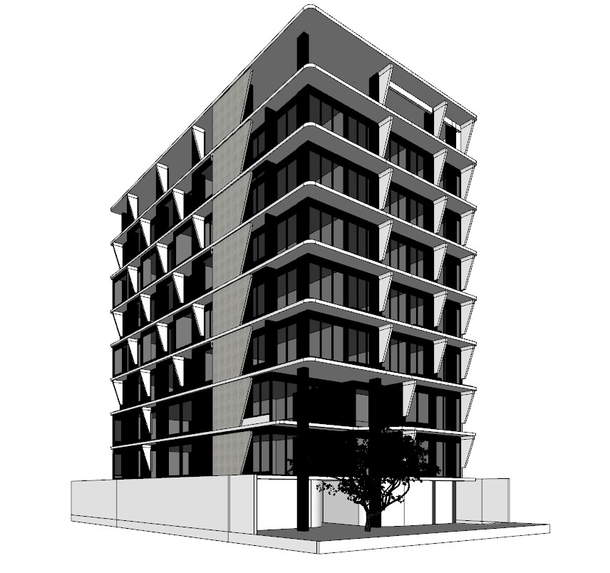 render a modernist architectural building with sleek angular lines use a palette of light gray for the concrete deep charcoal for the window frames and reflective glass the building should stand in an urban landscape with a clear blue sky and warm sunlight to create a bright and inviting atmosphere add subtle shadows for depth and dimension highlighting the building s geometric design