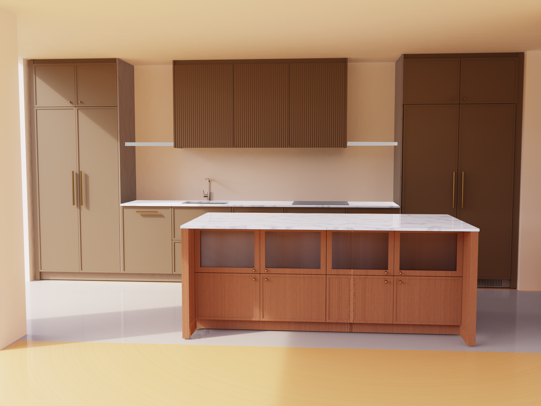 taupe painted kitchen with walnut island with reeded glass doors on the island
