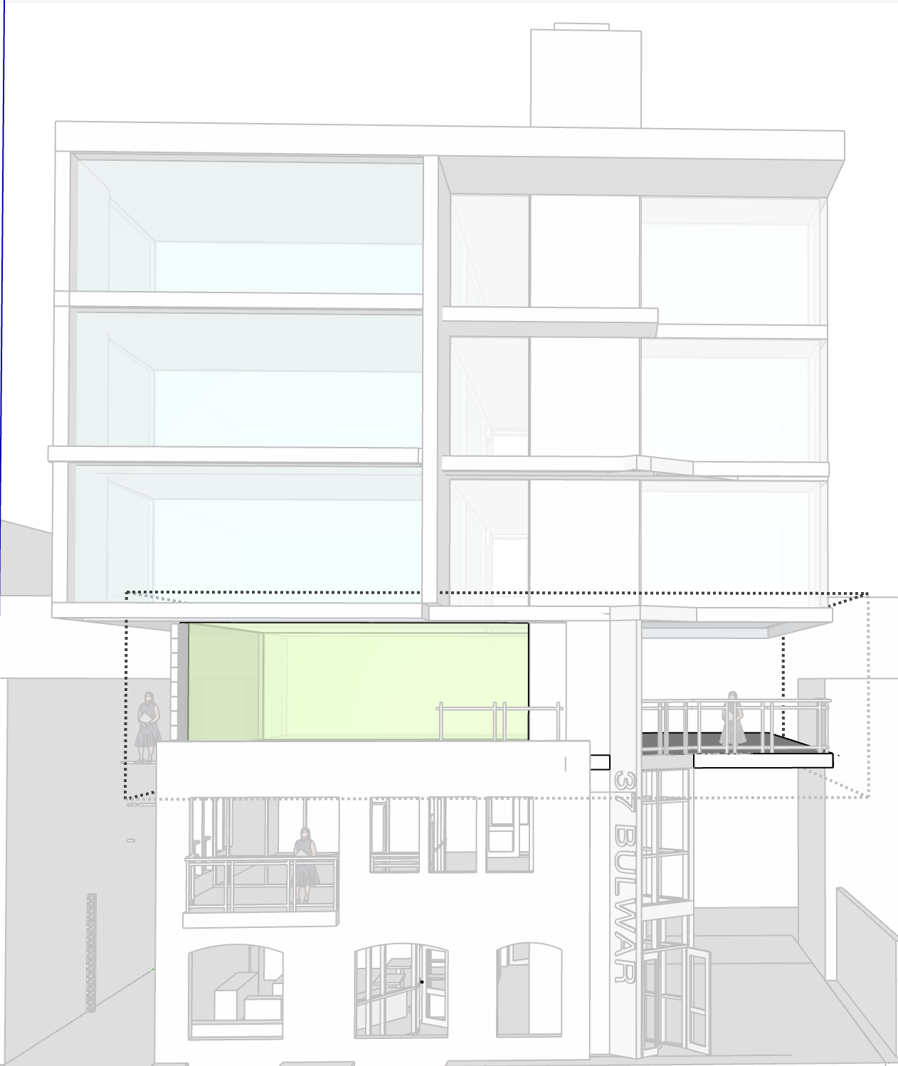 transform this sketchup massing cutaway of a mixed use building into a soft conceptual midterm presentation rendering maintain the overall geometry but simplify details using clean linework light shadows and translucent materials add subtle colour washes in warm neutrals and desaturated tones cream pale grey soft clay emphasize spatial hierarchy terraces and the relationship between the existing base building and the upper volumes give it a calm architectural atmospheric feel like an early stage design diagram from an oma or sanaa studio review avoid photorealism aim for diagrammatic clarity and conceptual softness