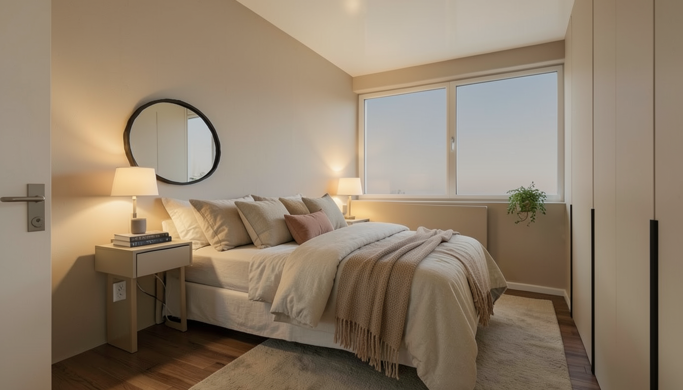 this is a model of a cottage add very few trees in background and some vegetation to give context light up the one sconce that is above the mural add creamish warm interior lighting very low brightness