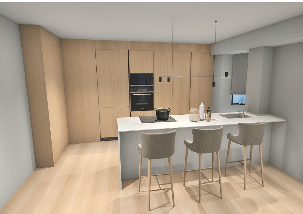 kitchen slightly masculine with kitchen units in light walnut peninsular in cement finish hi stool more modern walls to be in wall paper liene effect