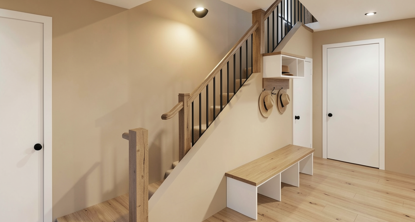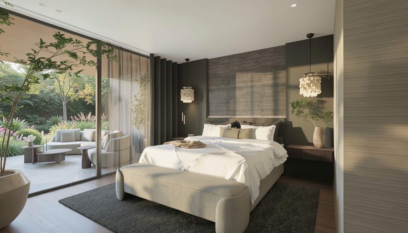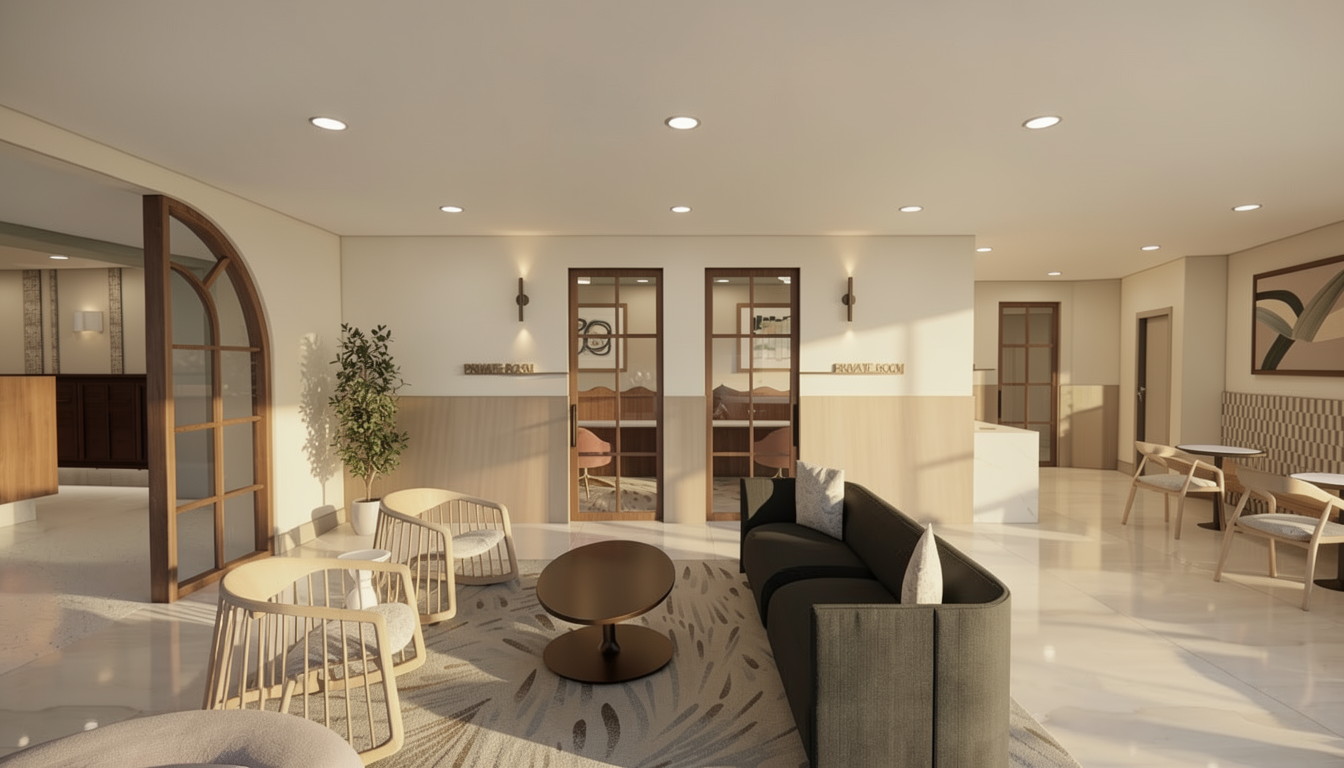 follow the design of the image exactly putting wood paneling where it is shown around the doors and grey brickwork where it is shown show all 7 houses in the frame as a landscaping plan