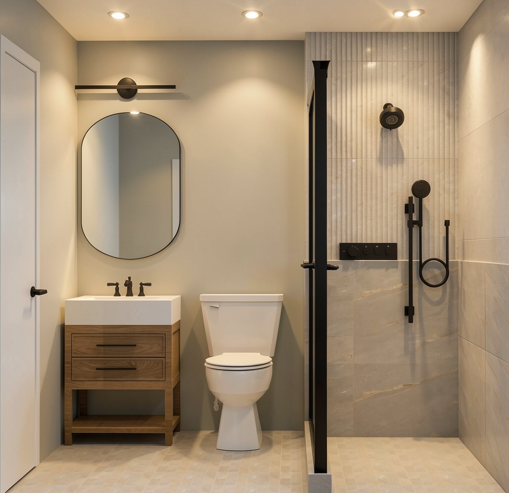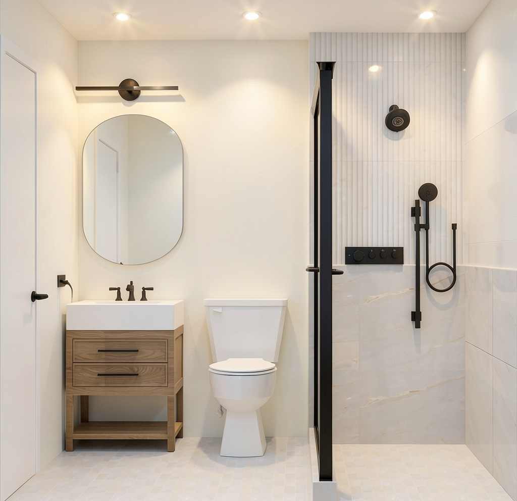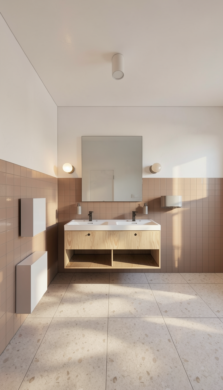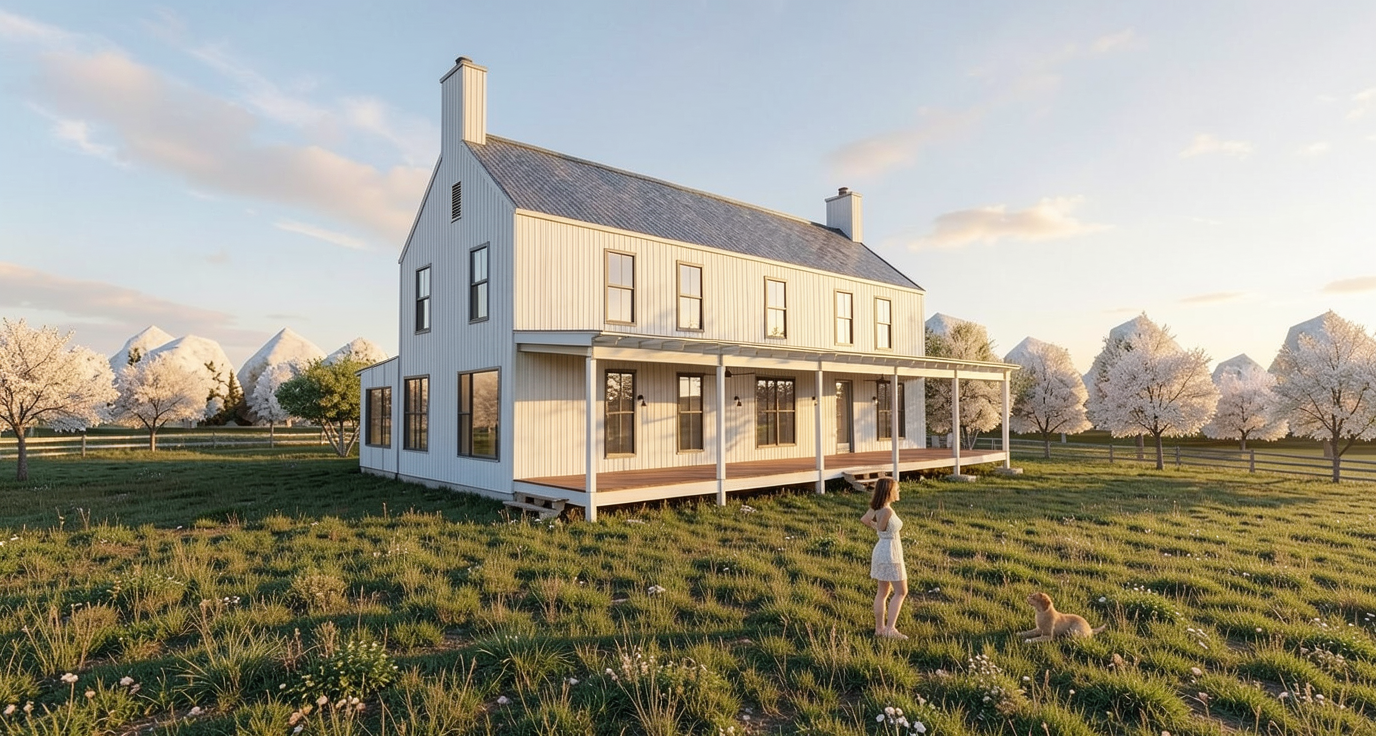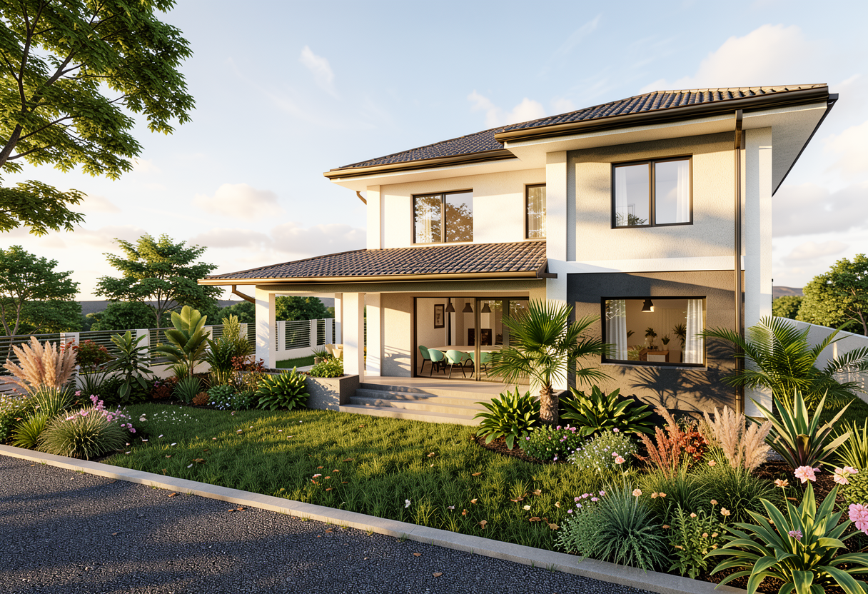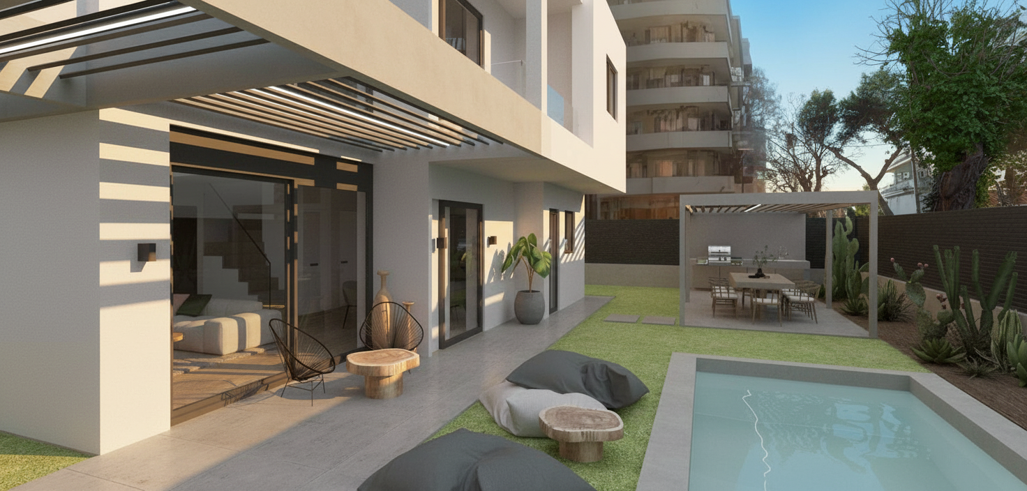 turn this rough massing model into a modern condo building with parking beneath total building is two stories of condos on top of a parking garage on the lower level include street trees and an entrance to the parking garage between columns on the right hand side the flat rooftop should include some occupiable deck area rooftop furniture and potted plants for reference this structure is 40 tall the setting is an urban corner near downtown raleigh with mostly 2 4 stories buildings nearby largely single family homes of a historic nature off to the right and the warehouse distract off to the left the building should be clad with a contemporary fiber cement panel with vertical windows that are mostly floor to ceiling image should be a dusk shot with lighting emanating from the windows style should be photoreal