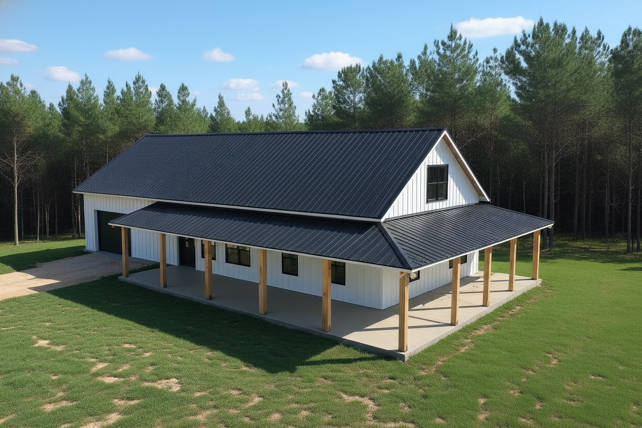 modernist exterior shot a modern barn style building set in a serene landscape the building features a sleek black metal roof and pristine white siding adorned with natural wood accents surrounding the structure is a lush green lawn with tall verdant pine trees in the background the sky is a vivid blue dotted with soft fluffy white clouds the atmosphere is peaceful and inviting capturing the essence of a sunny day in the countryside architecture